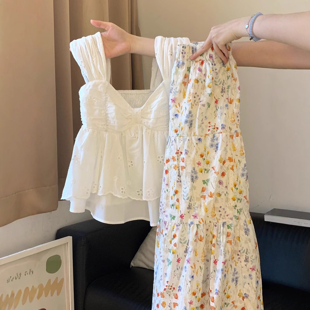韩系夏日穿搭一整套减龄套装女镂空提花背心吊带高腰碎花裙两件套