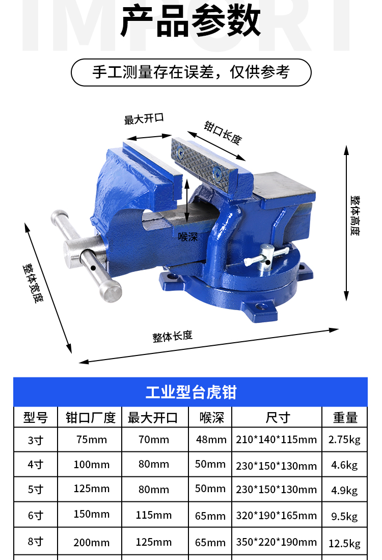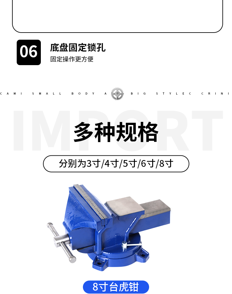 仕様とモデル バイス 3inch 個 [重量 2.75kg],バイス 4inch 個 [重量 4.6kg],バイス 5inch 個 [重量 4.9kg],バイス 6inch 個 [重量 9kg],バイス 8inch 個 [重量 12.5kg],8inch 鋳鋼ベンチバイス [重量14.8kg]