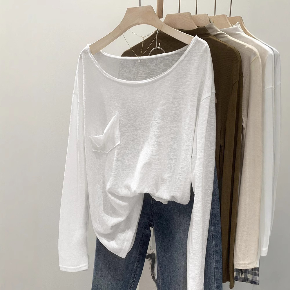 女性用薄手日焼け止めブラウス、ローユー字ネック白長袖Tシャツ、春秋シックなリラックス感、レイジースタイルトップス