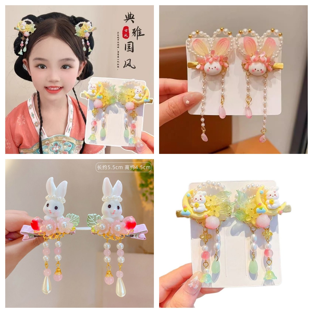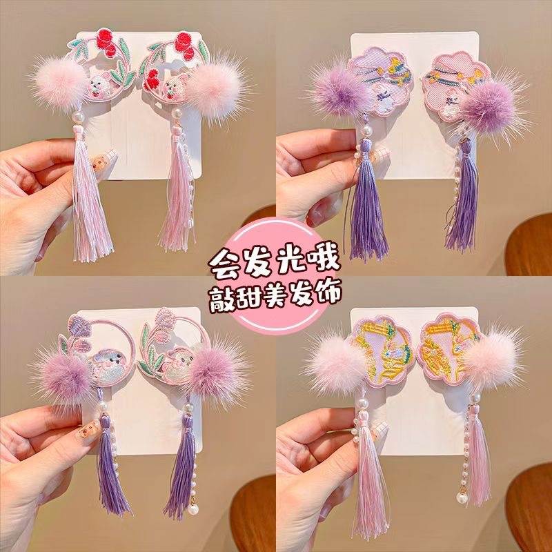 中秋女童发饰古风刺绣月兔毛绒球装饰光头发夹国风侧边夹汉服配饰