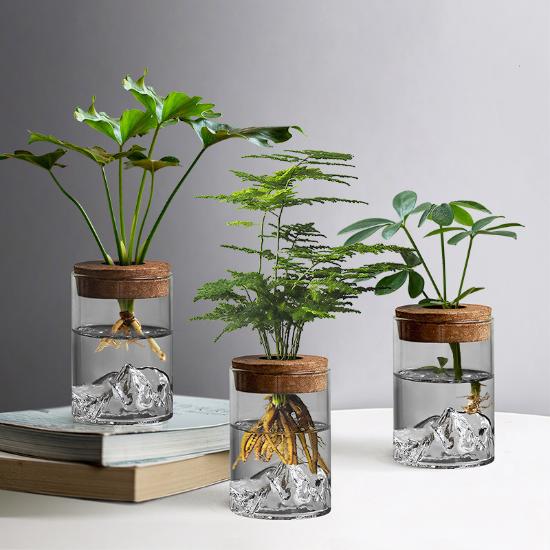 ハイグレードな山の風景を備えた水耕栽培ボトル、透明なストレート高ホウケイ酸ガラスの小さな植物容器、水耕栽培植物風景ボトル