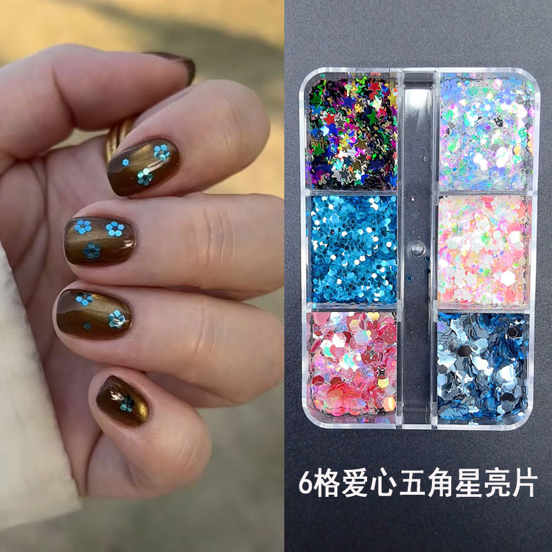 6格美甲饰品亮片花朵闪粉爱心五角星幻彩粉色亮片极光指甲亮片