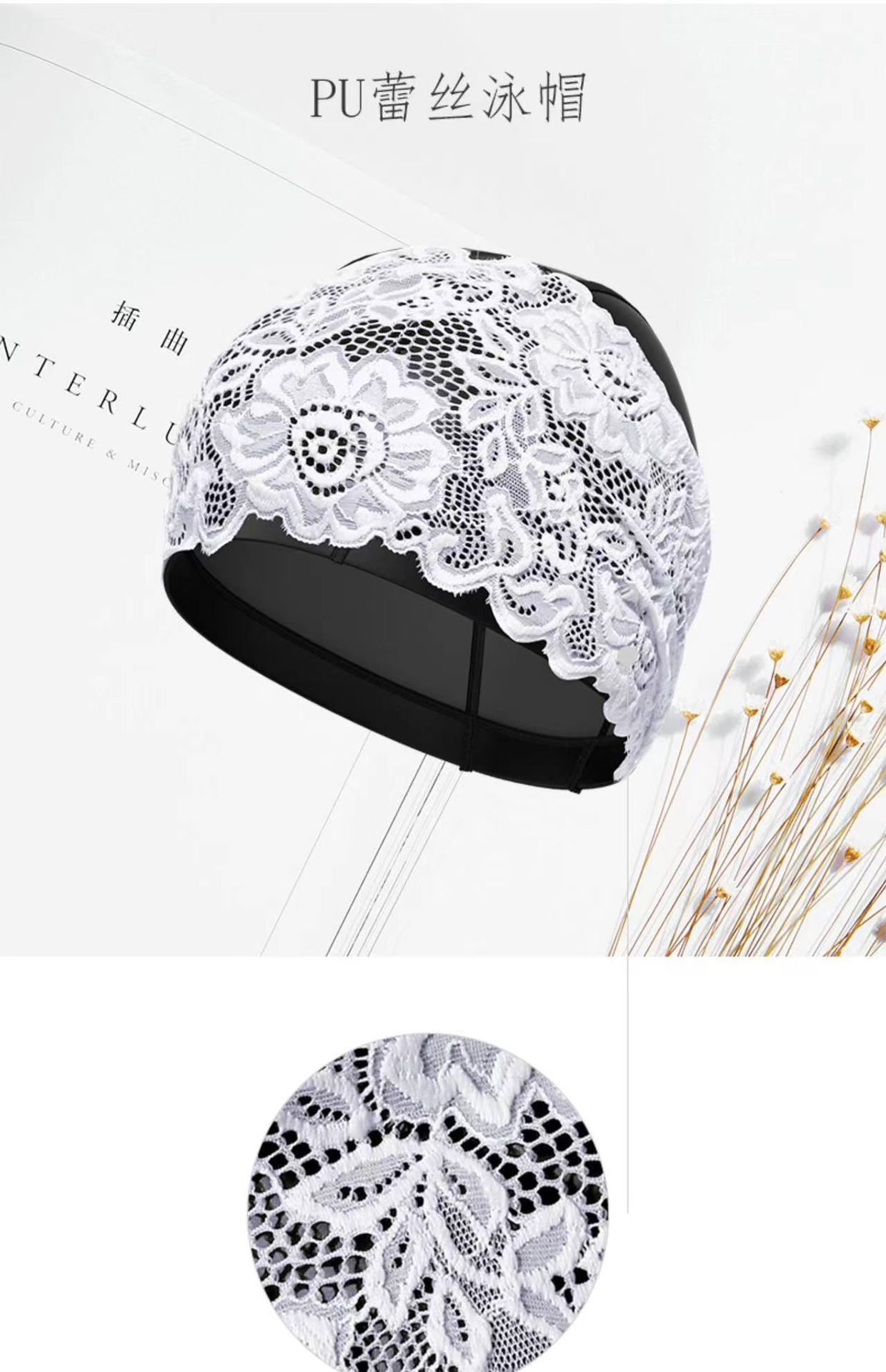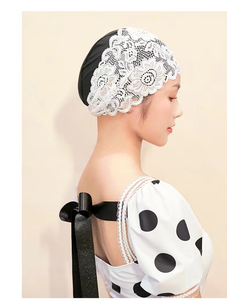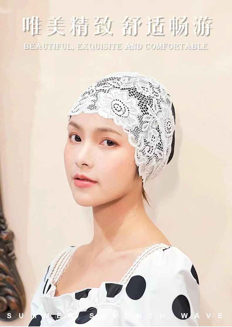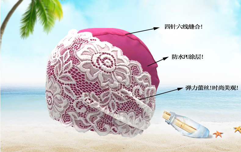 工場直販防水PUレース水泳キャップ、頭を締め付けない温泉水泳キャップ