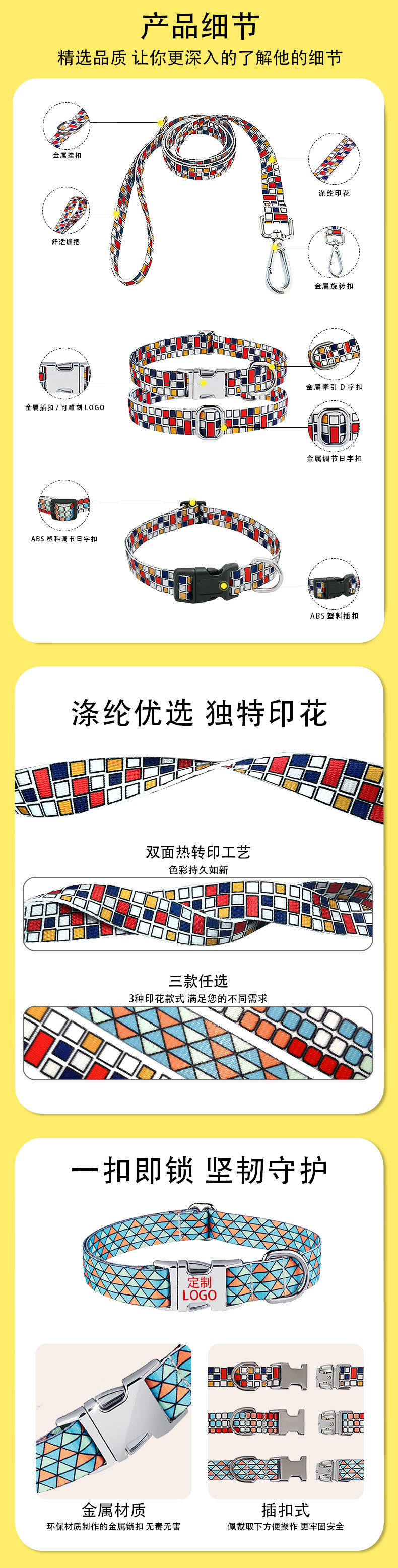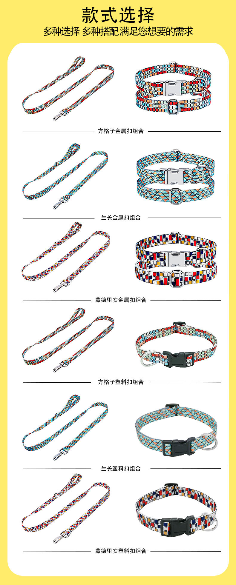 スクエアメタルバックルカラー,成長金属バックル首輪,モンドリアンメタルバックルカラー,角型トラクションロープ,成長リード,モンドリアンのリード