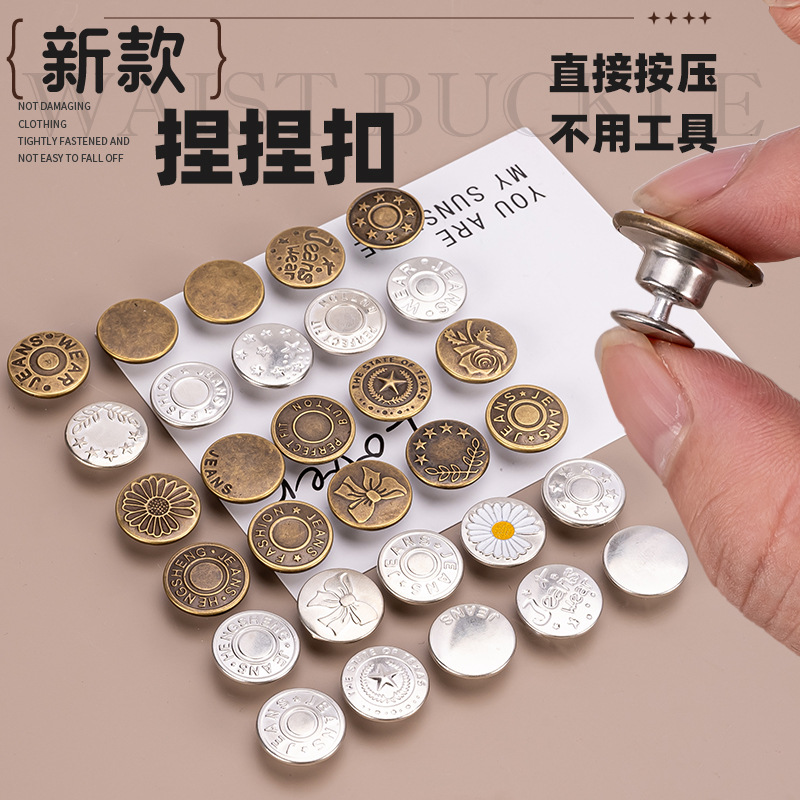 新しいプレスタイプのウエストボタン、釘不要、取り外し可能なジーンズのウエストを大きく小さく調整できる金属製ウエスト調整ツール