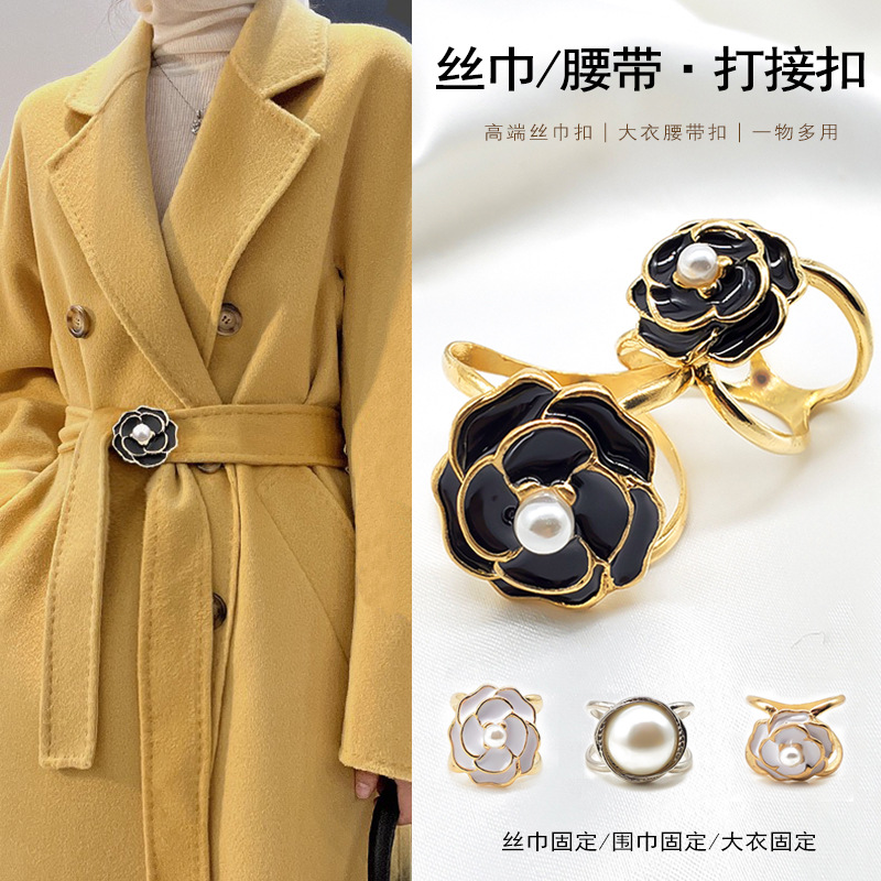 韓国風パールシルクスカーフバックル、シンプルでファッショナブルな椿ショール装飾バックル、Tシャツベルト結び目バックル、在庫あり