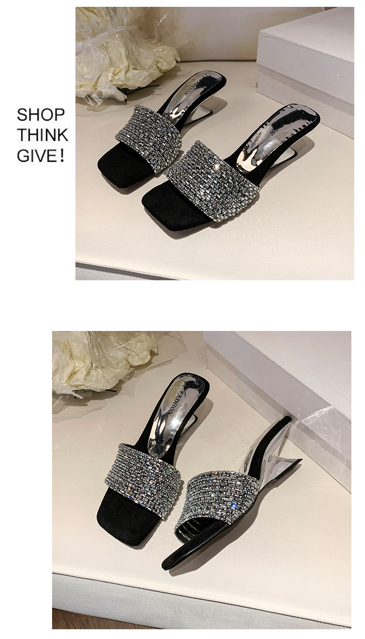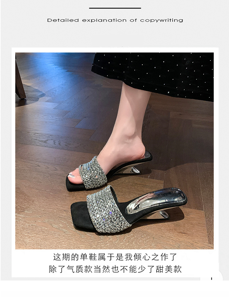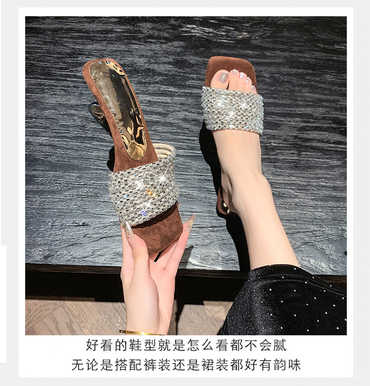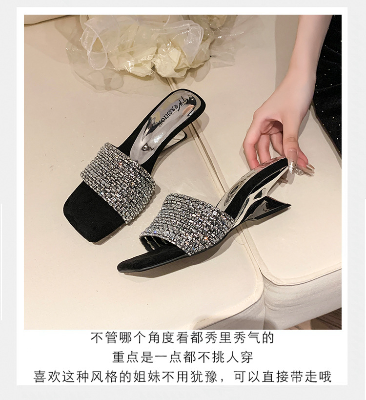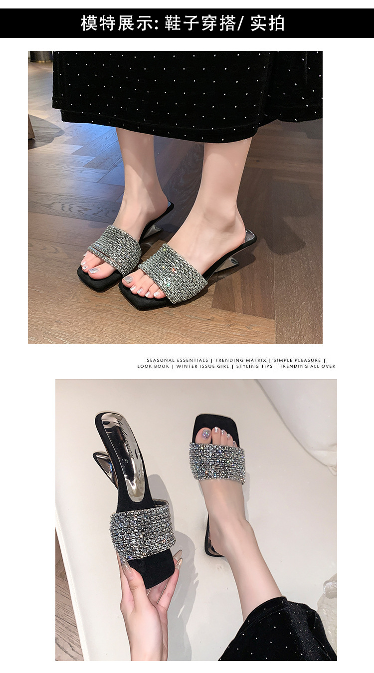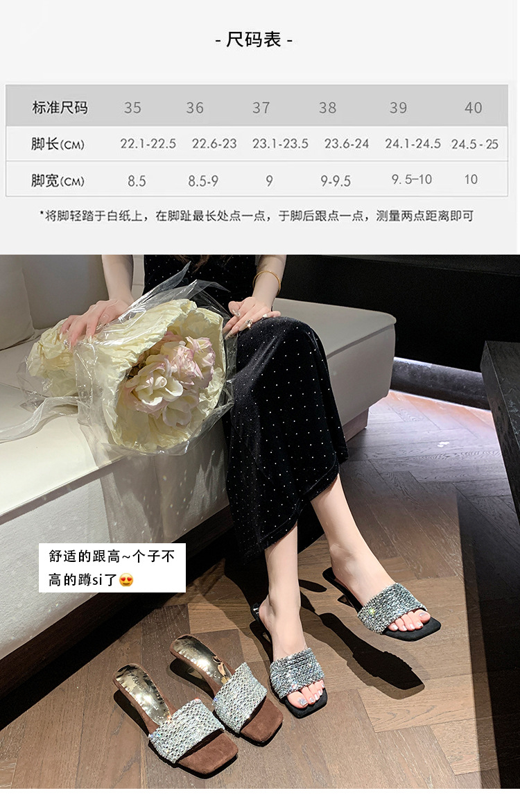 2025 新しいレディースサンダルとスリッパファッションラインストーンスクエアヒールミッドヒールオープントゥ大型スリッパ外国貿易卸売