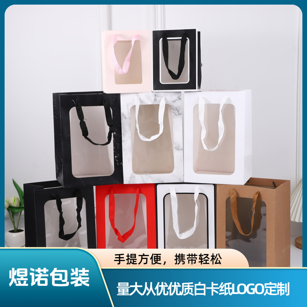 透明窓付きハンドバッグギフトバッグ、花束用紙袋、ギフトボックス、包装袋、プレゼントバッグ