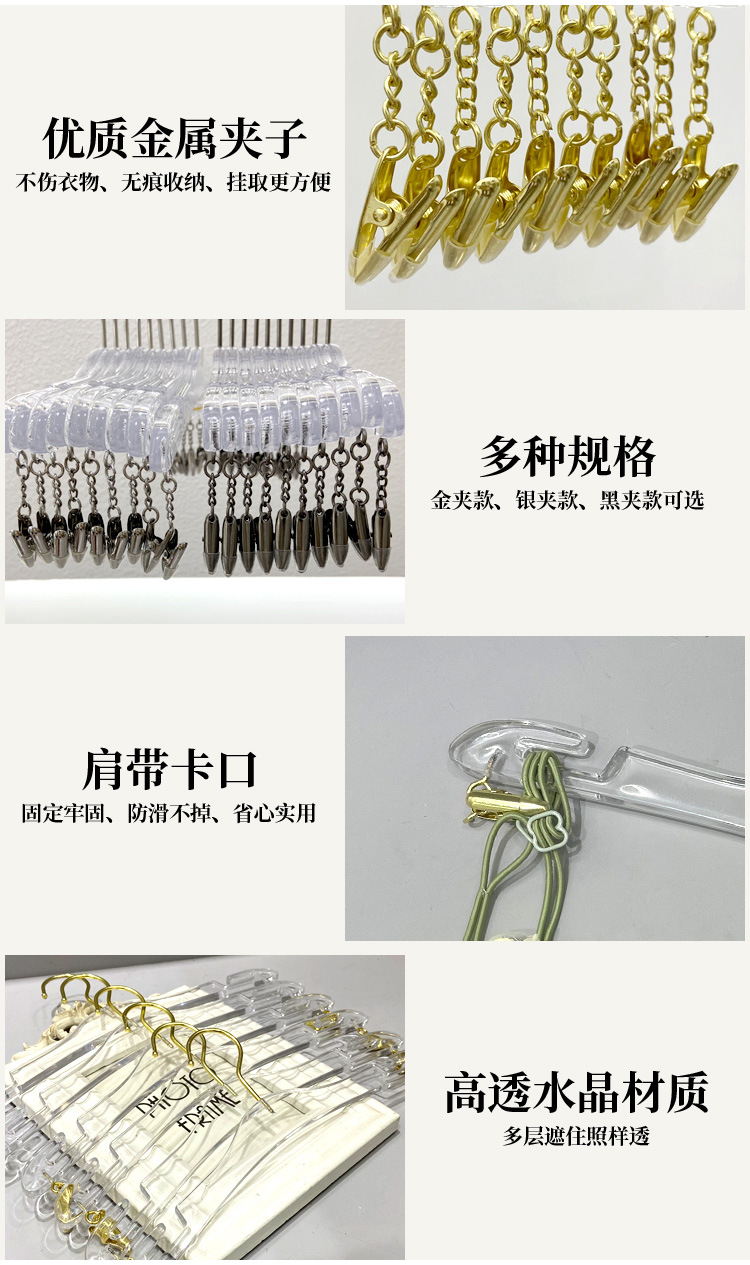 颜色 透明水晶美背衣架无链【金钩】,透明水晶内衣架长链【金色】,透明水晶内裤架短链【金色】,透明水晶美背衣架无链【银钩】,透明水晶内衣架长链【银色】,透明水晶内裤架短链【银色】,透明水晶美背衣架无链【枪黑】,透明水晶内衣架长链【枪黑】,透明水晶内裤架短链【枪黑】