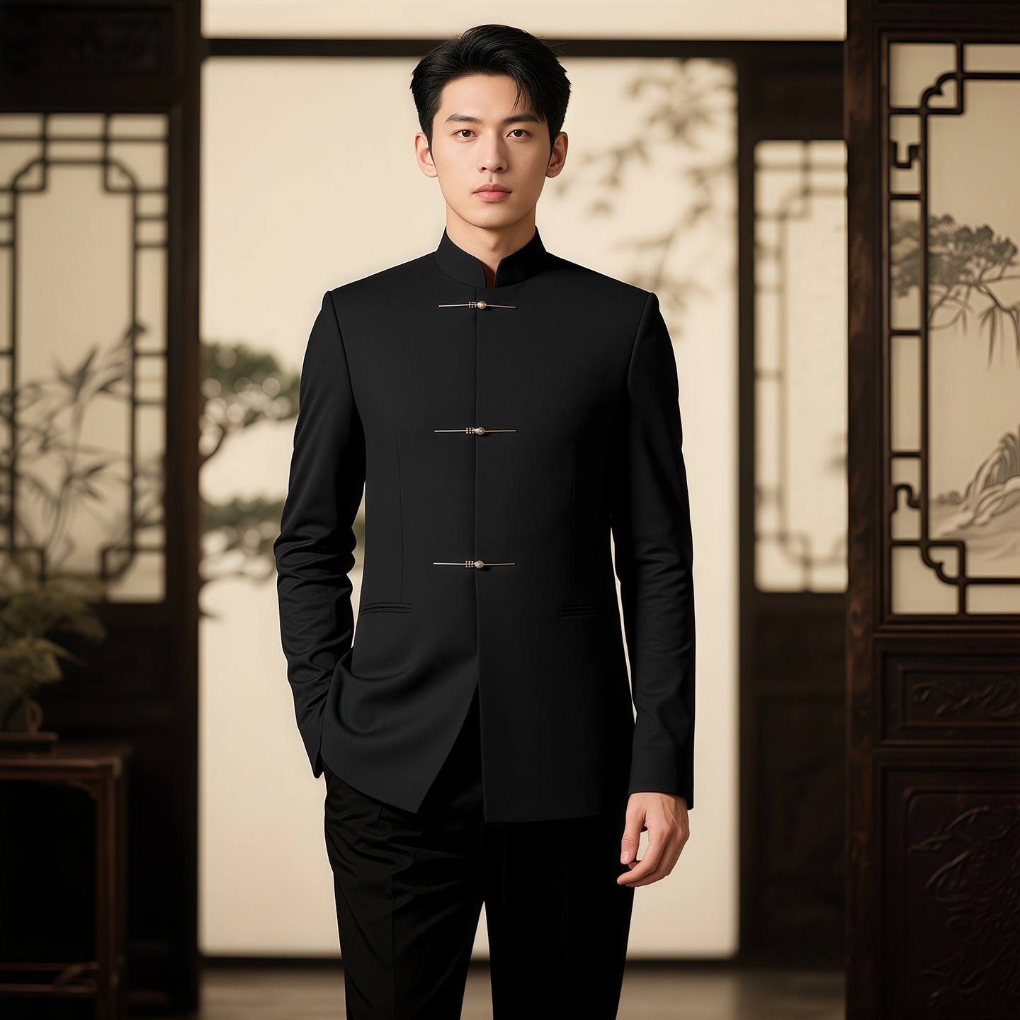 新しい中国風のツーピーススーツ、ティーンエイジャーのスタンドカラースーツ、唐スーツ、メンズクラススーツ、結婚式の婚約スーツジャケット