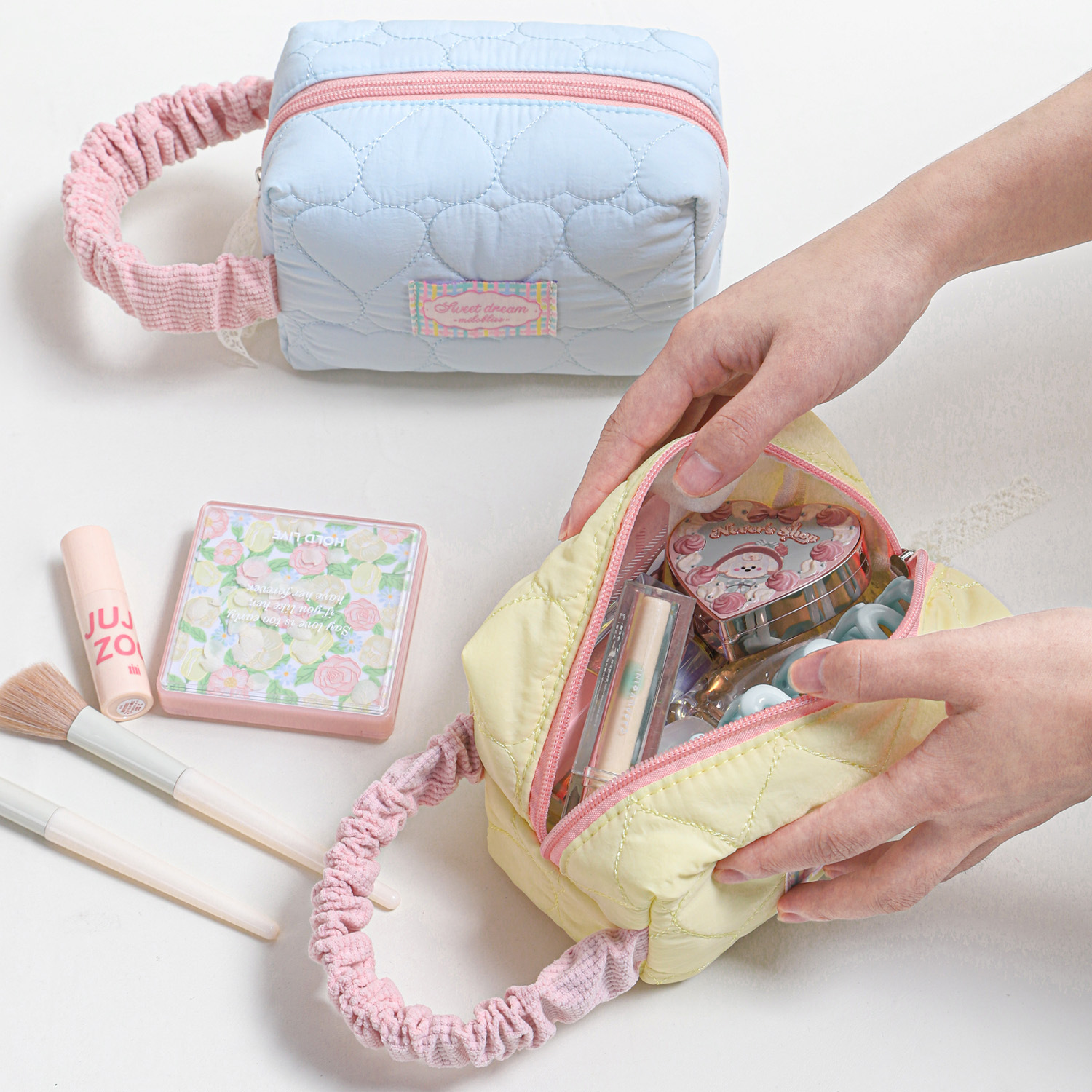 蕾丝小众手提化妆包绗缝爱心外出游玩收纳包可爱少女心便携收纳袋