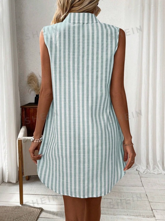 2025 ヨーロッパとアメリカの貿易クロスボーダーミニマリストノースリーブ V ネックボタンストライプシャツドレスファッショナブルなルーズカジュアル女性