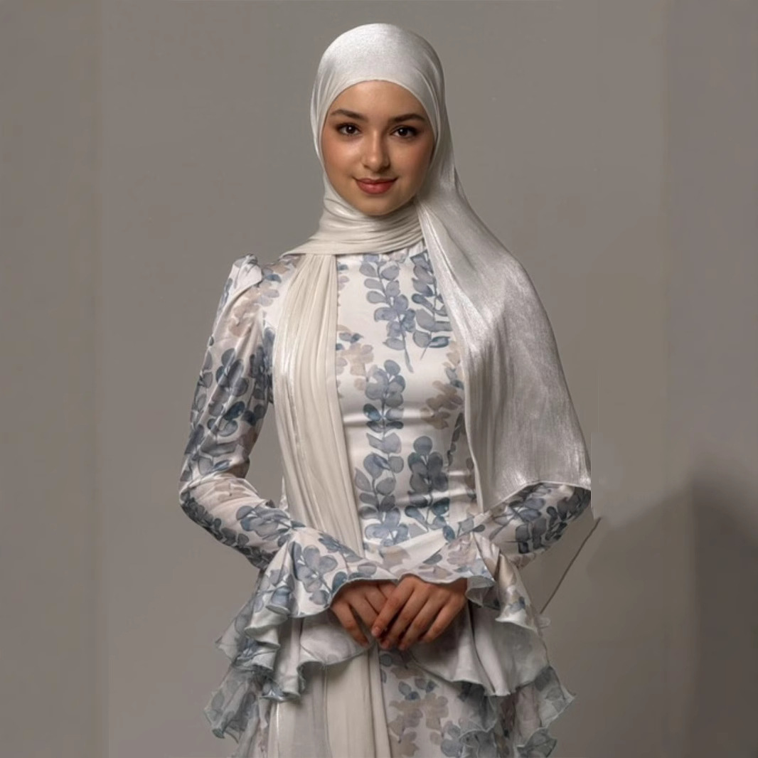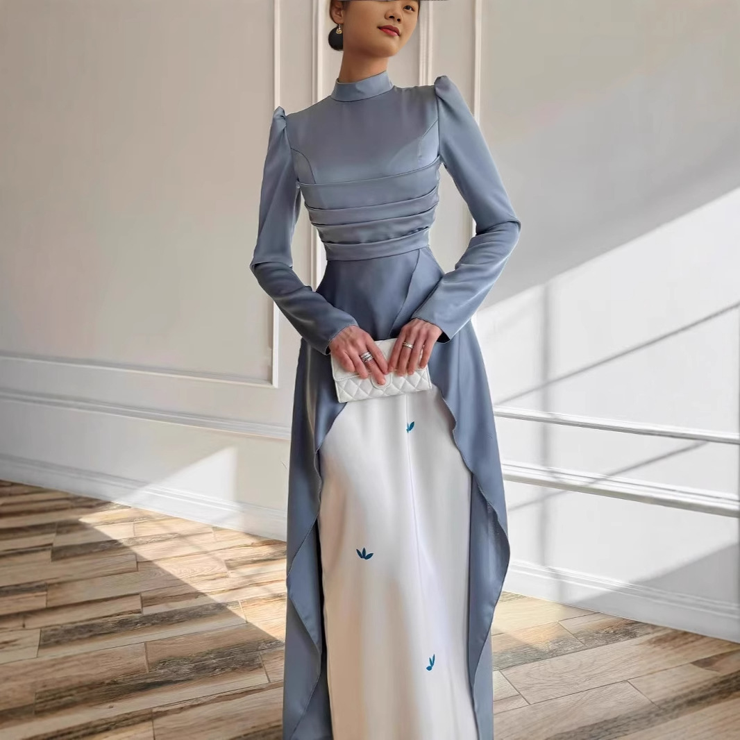 2025年新作 フェスティバル・宴会用ドレス ライトグレーの微光沢ヘッドスカーフ ダイヤモンドチェーン装飾 東南アジア風 ウエストシェイプ スイートロングドレス