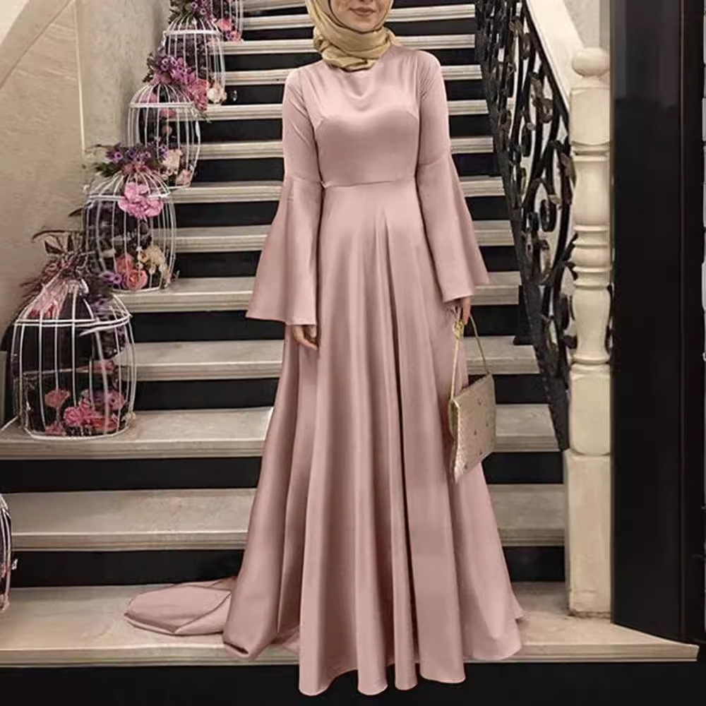 2024 外国貿易婦人服新しい中東イスラム教徒ドレスフレアスリーブウエスト大きな裾ファッションサテンドレス