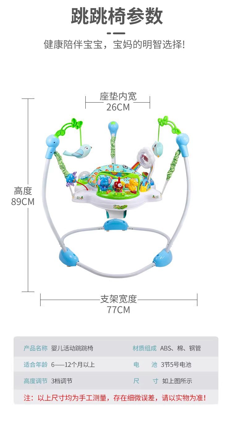 备注:婴儿跳椅带灯光音乐,可调节高低,自备2粒5号电池