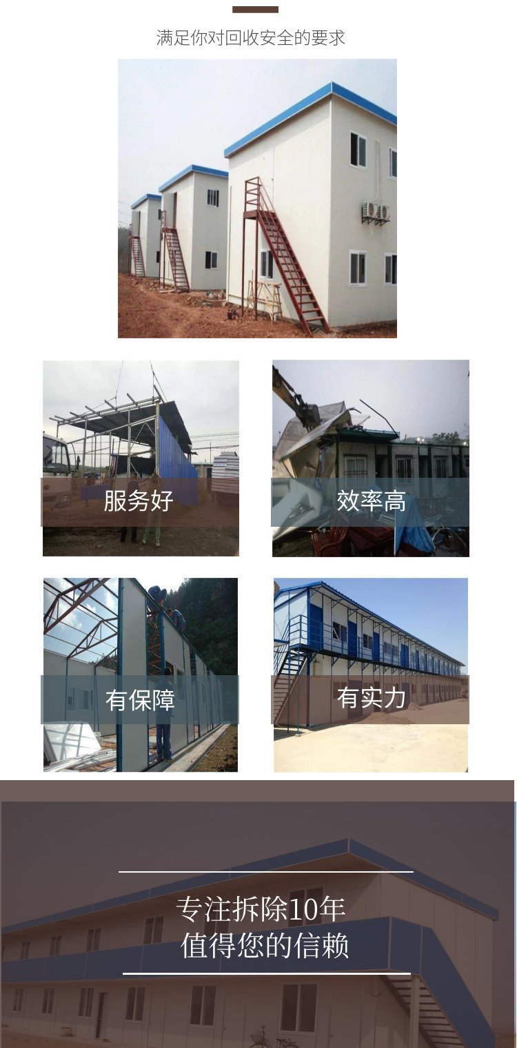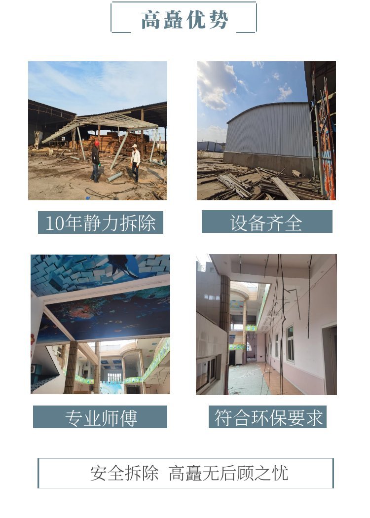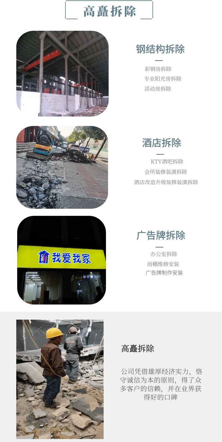 五、承包拆除工程。机械拆除楼房及大型厂房,负责垃圾托运并清理现场。废旧金属、废旧工业设备、废旧机械设备、废旧电子电器设备、废旧设备、空调、电脑及配件等面向对象:酒店、娱乐场所、建筑工地及家庭等。