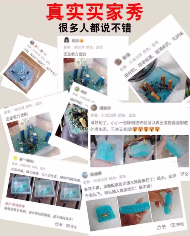 使い捨て灰皿、袋を破るまでに8秒、冷水で溶ける、使い捨て灰皿、小さな袋、水にさらされると固まります。