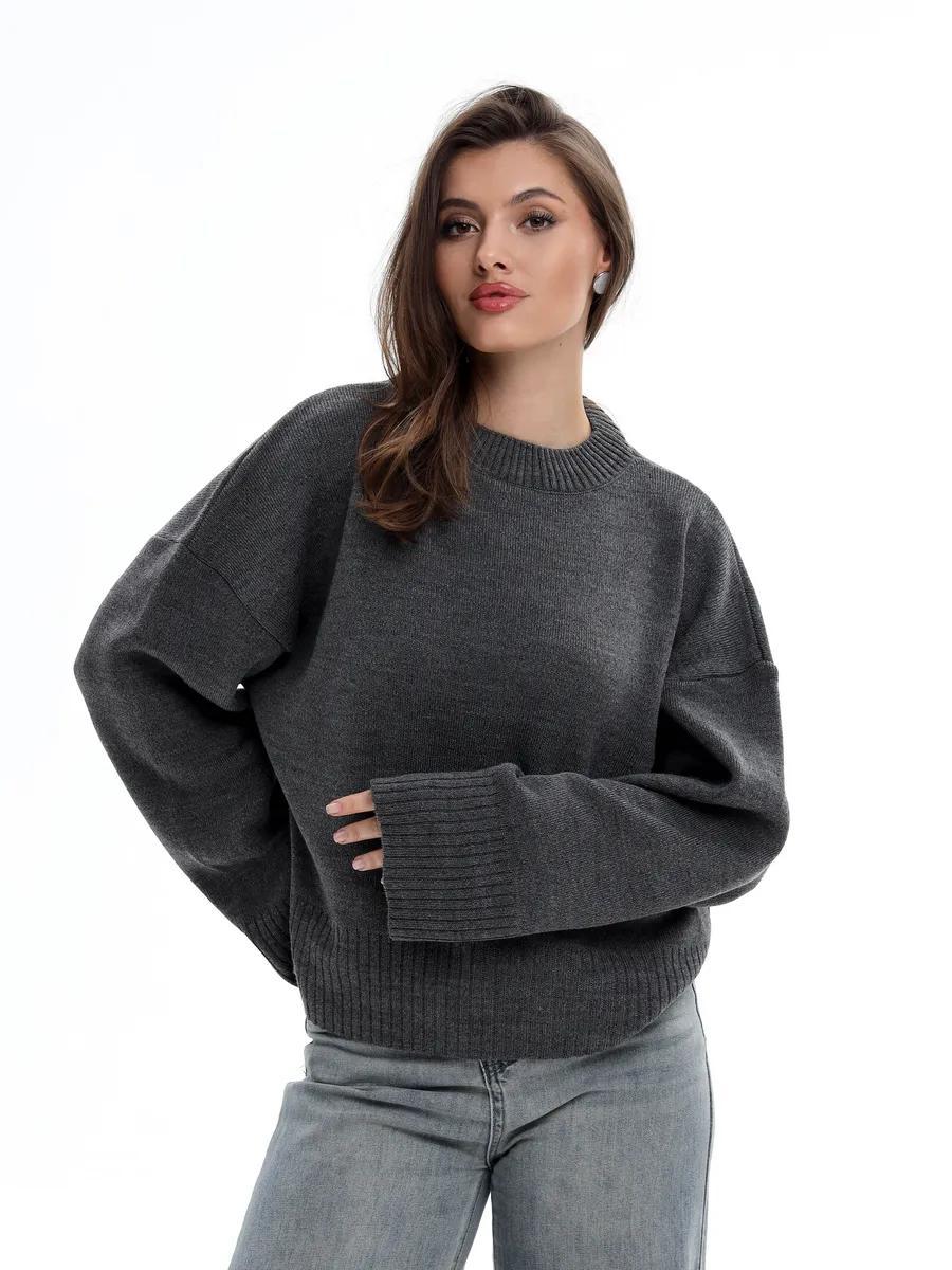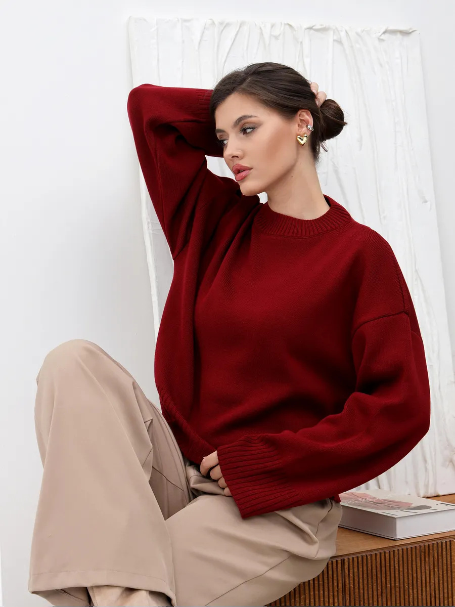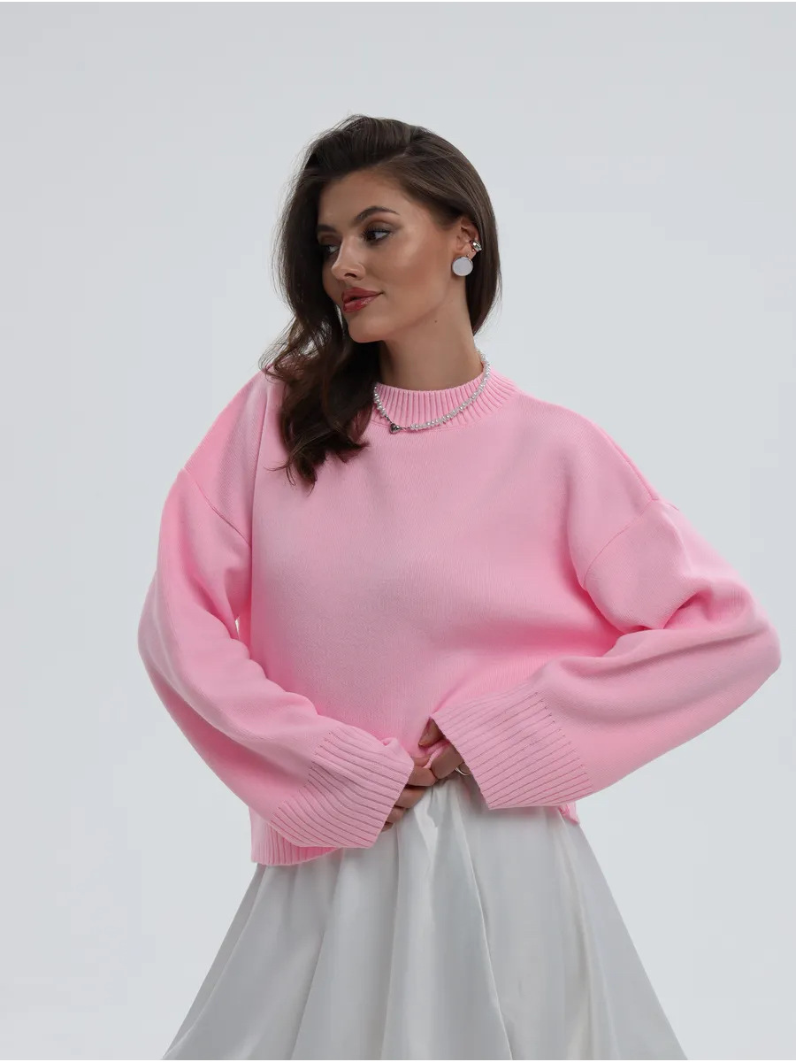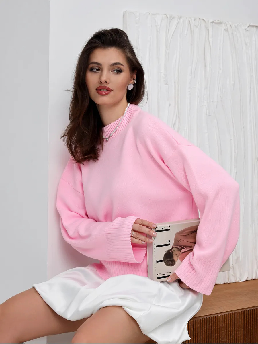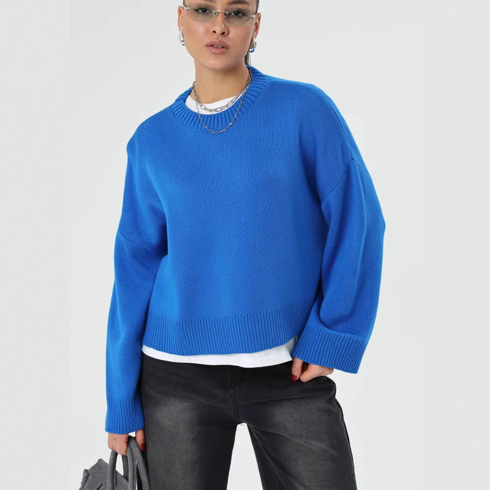 2025跨境宽松欧美慵懒风短款套头毛衣女宽松针织长袖圆领上衣