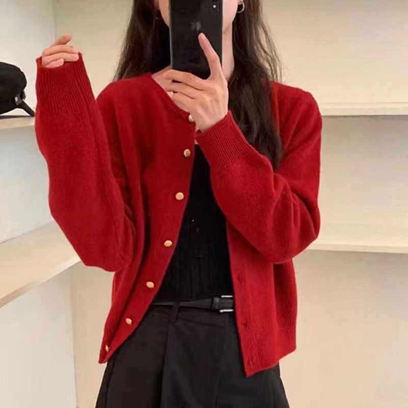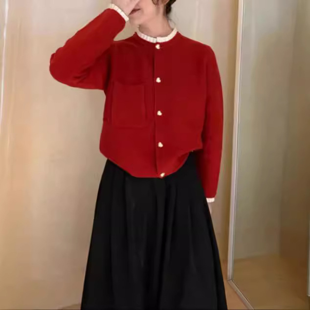 新作韓国版2025秋木製風耳飾り付きラウンドネックセーター女性用、ニッチなニットファッション、優しいスタイルのカーディガンジャケット女性用