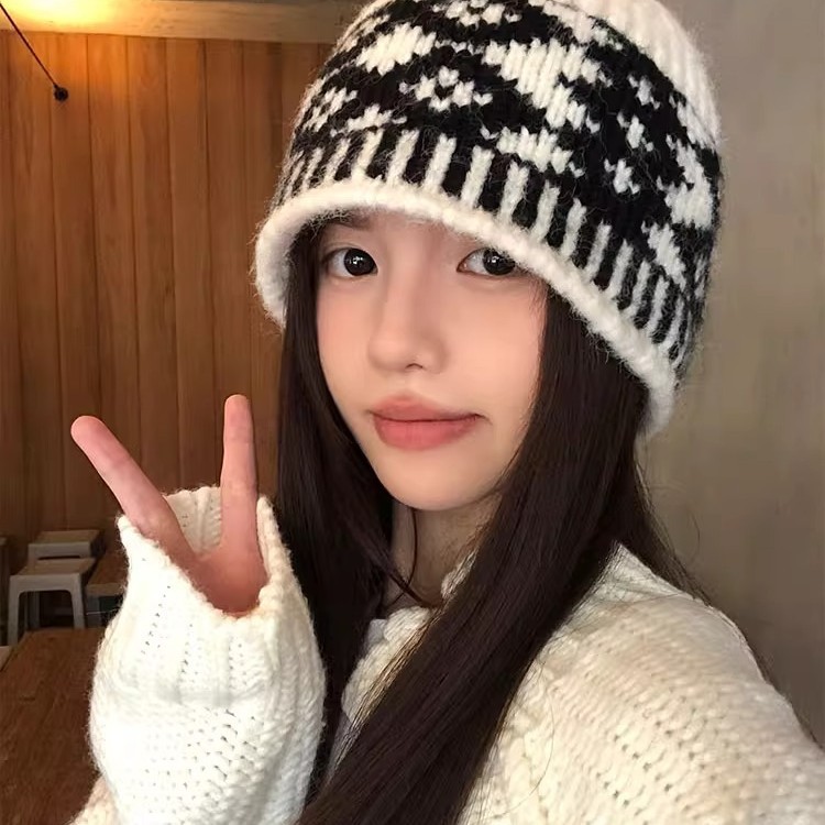 女秋冬季菱形格子毛线帽子小众设计感针织帽保暖防寒包头冷帽圆顶