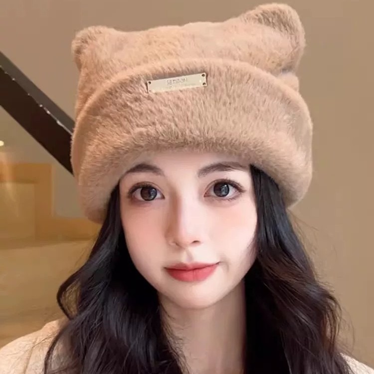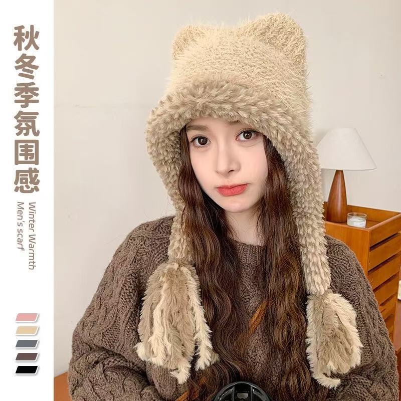 2025年冬季新款流苏毛绒绒熊耳朵保暖护耳朵防寒针织显脸小雷锋帽