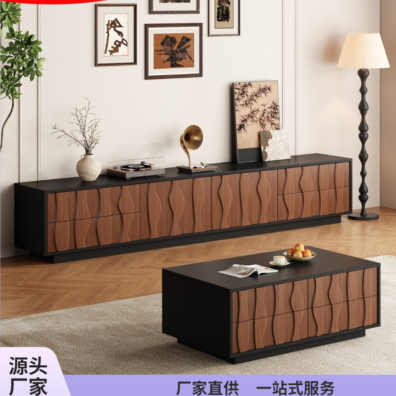 复古中古骨骼线电视柜茶几组合现代简约胡桃色客厅家用小户型落地