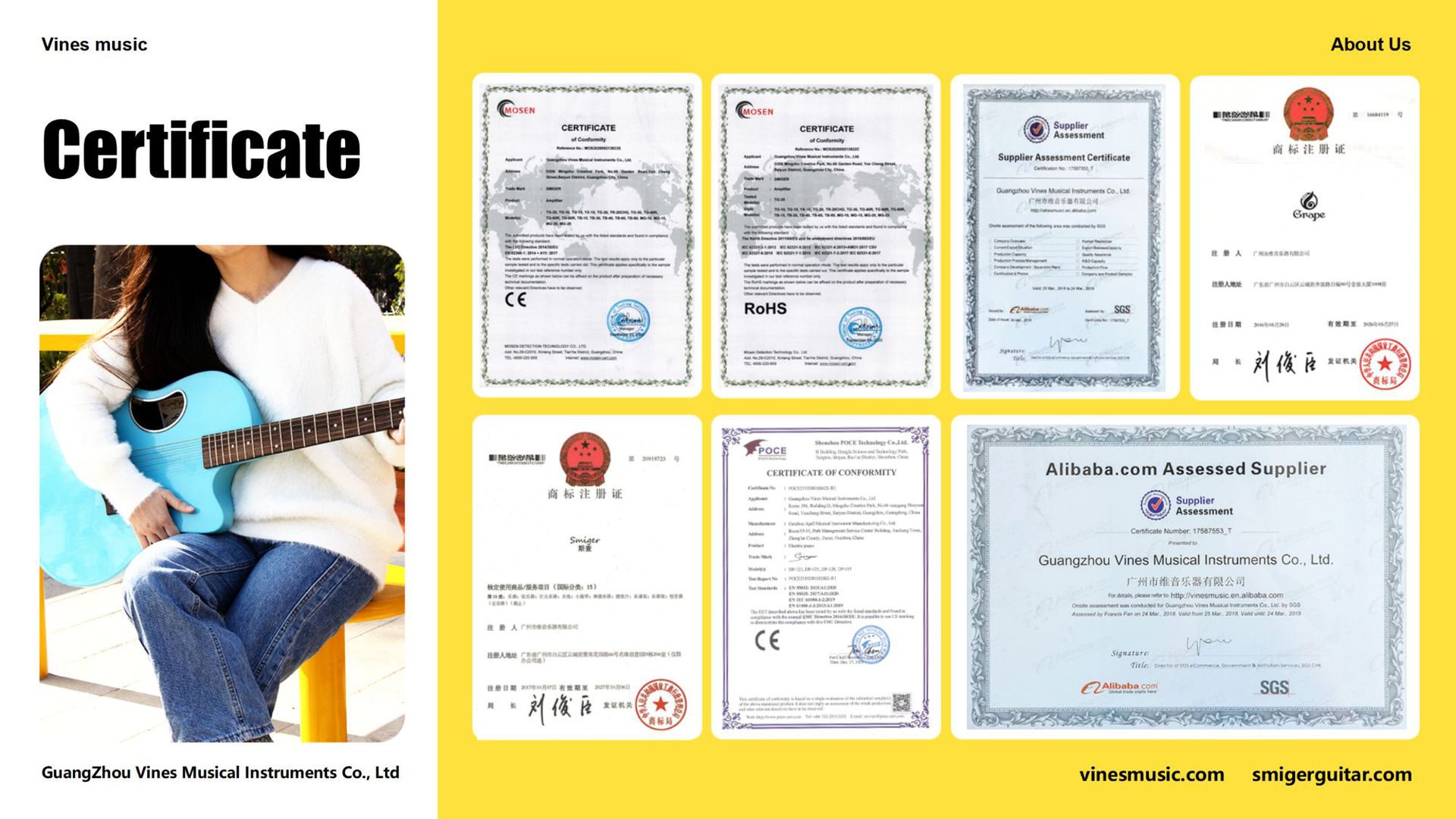 电吉他有 RoHS、CE 环保认证,音箱过 CE 认证,出口欧美、南美、东南亚完全没问题!Smiger(斯麦)和 Luxars 两大品牌,在多个国家已注册,不怕被抢注,跟你长期合作有保障~