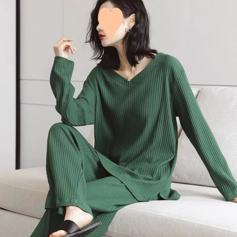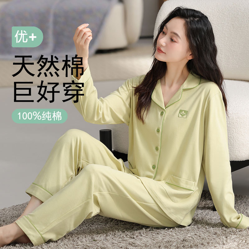 100%纯棉睡衣女士秋冬季全棉长袖女生纯色宽松可外穿家居服套装
