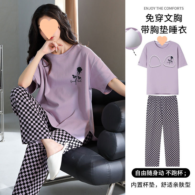 新しいスタイルの胸パッド付きパジャマ、女性用純綿、夏用半袖長ズボン、カジュアルでゆったりとした大きいサイズのホームウェアセット