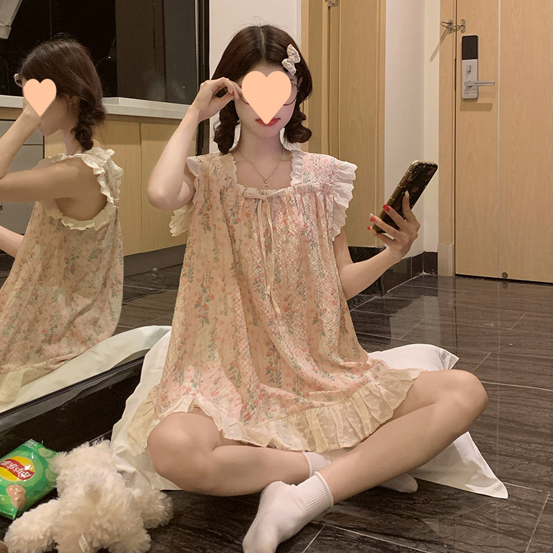 韓国インレディース韓国版スイートドリームチェリーロマンチックな視覚的なコントラストカラーレースホームウェアパジャマ/ナイトガウン