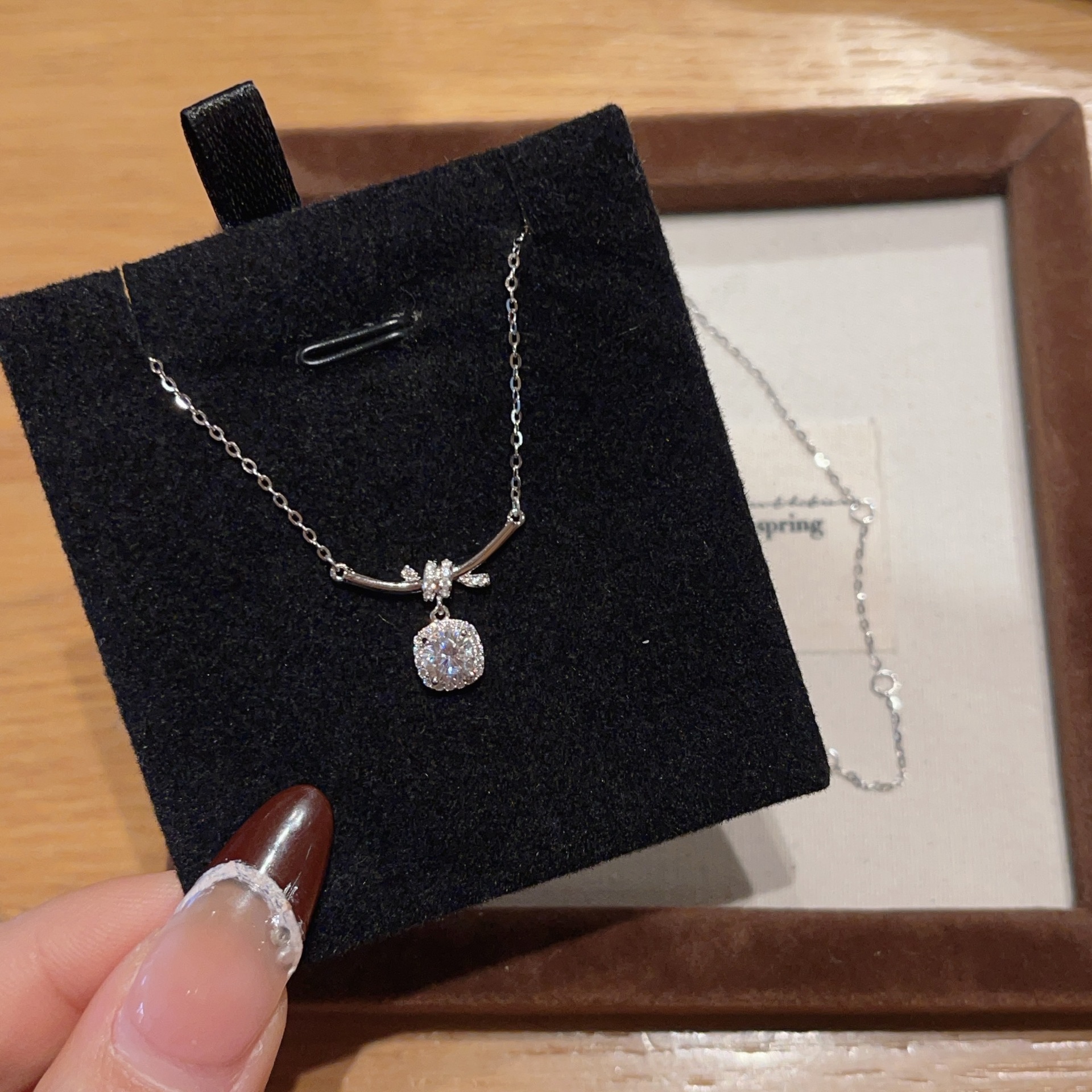 s925纯银精致绳结方糖项链女小众设计轻奢百搭气质百搭锆石锁骨链
