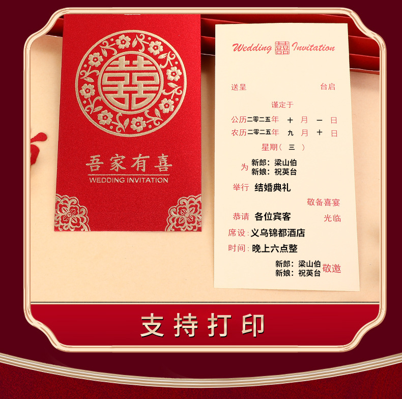 メーカー直販創意結婚流蘇招待状箔押し招待状二つ折り赤色中国風喜帖結婚式招待状