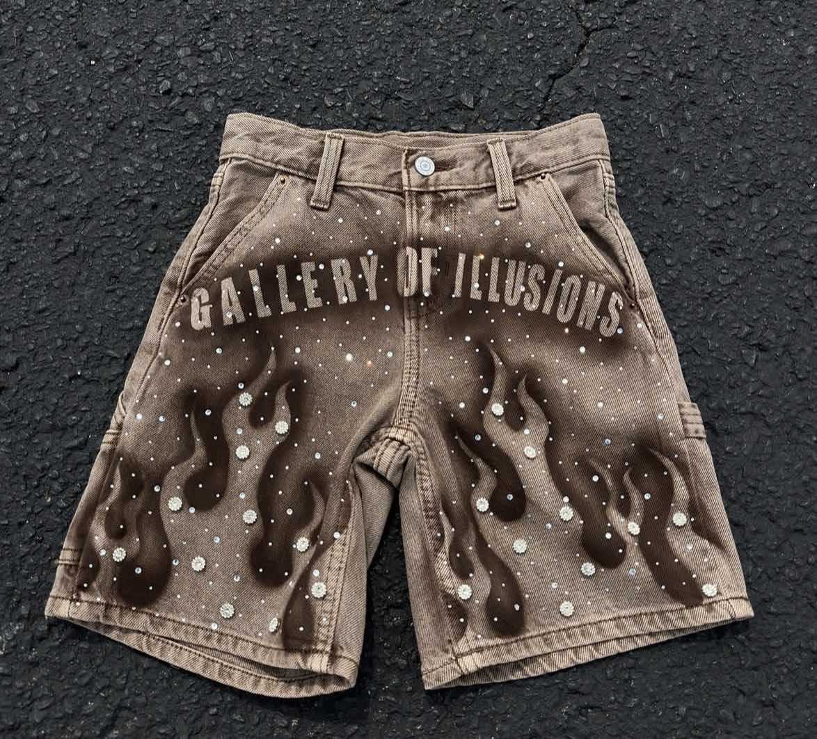 y2k 越境貿易夏のハイストリートトレンディなメンズショーツ手描きプリントホットダイヤモンドルーズデニムショーツ男性用