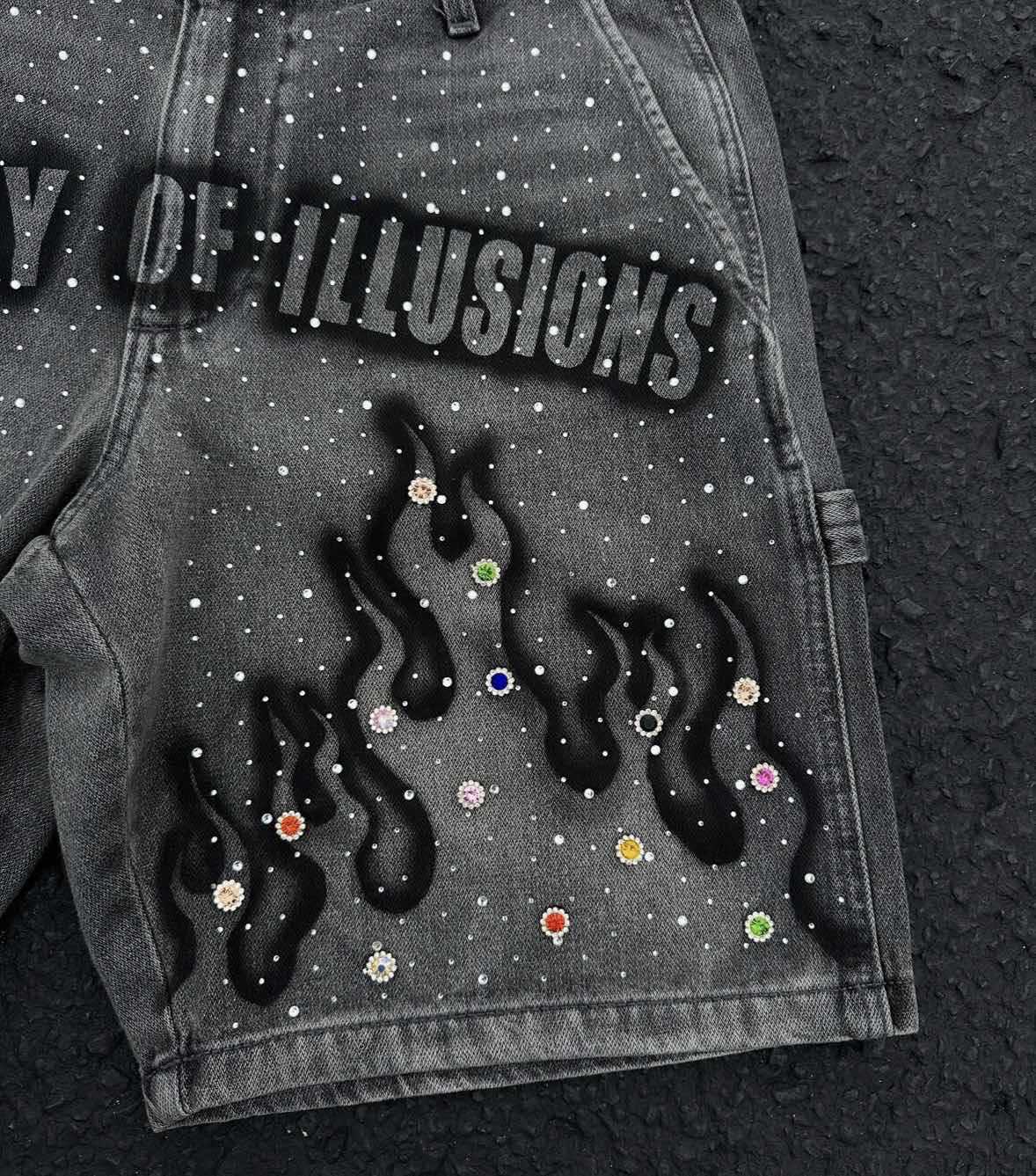境外直销新款欧美潮流个性烫钻牛仔短裤慵懒风高街小众阔腿五分裤