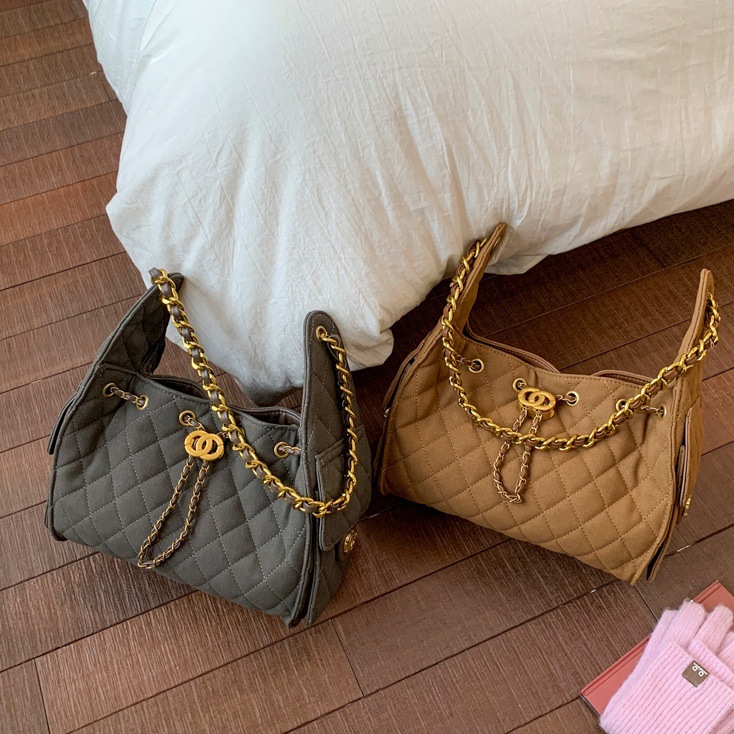 高级感菱格链条包包女2025新款潮百搭单肩斜挎包大容量抽绳水桶包