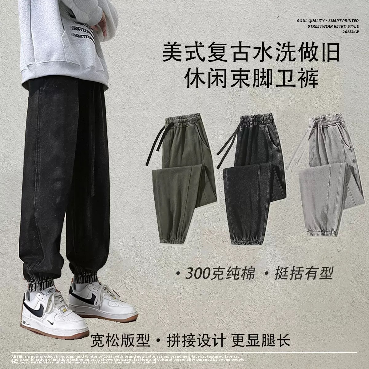 跨境专供纯棉重磅300g水洗做旧宽松卫裤男洗水复古束脚卫裤现货