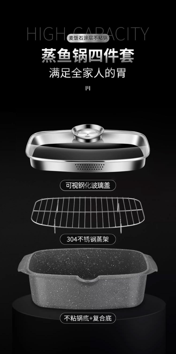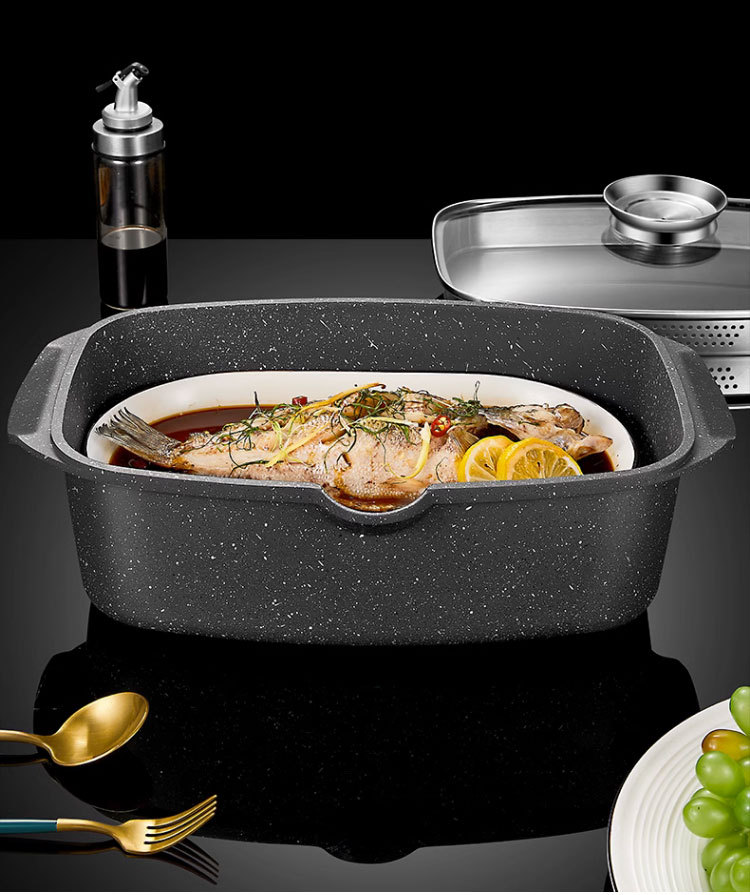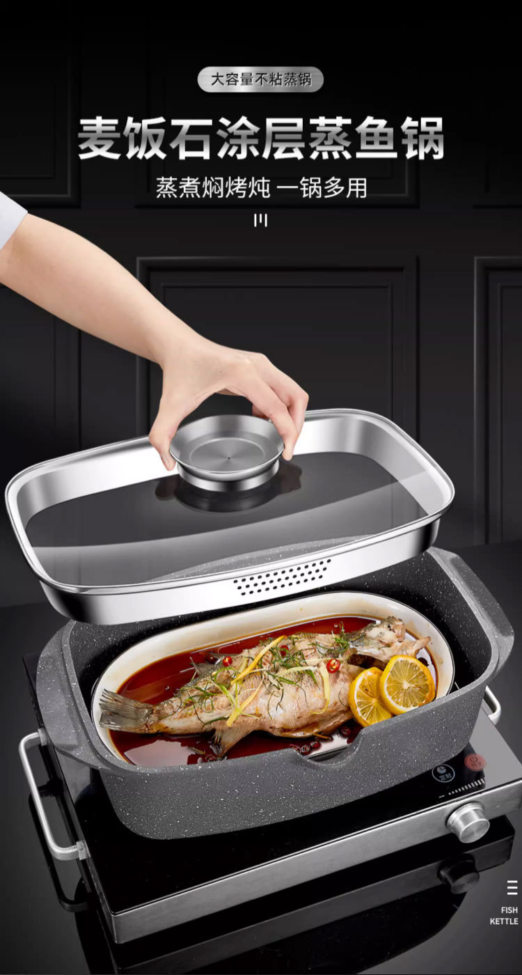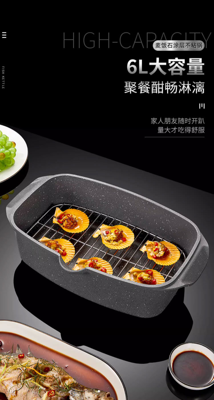 蒸し魚鍋家庭用麦飯石は長方形の大型多機能焼き魚蒸し魚鍋ガス電磁ストーブにくっつかない