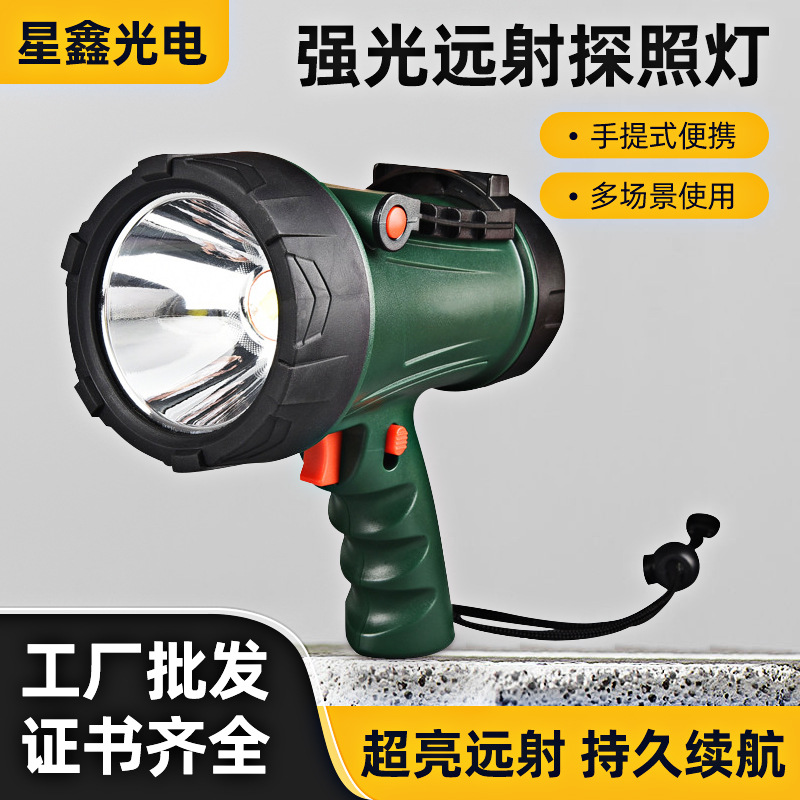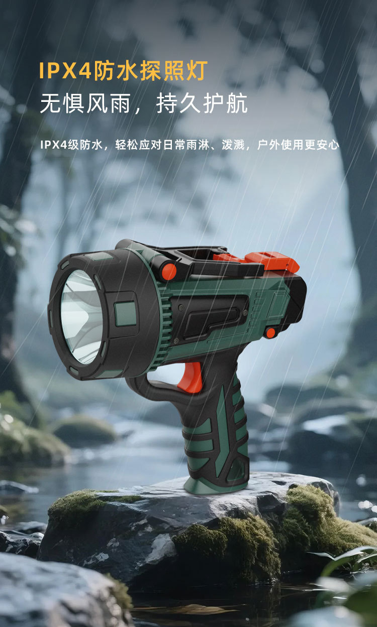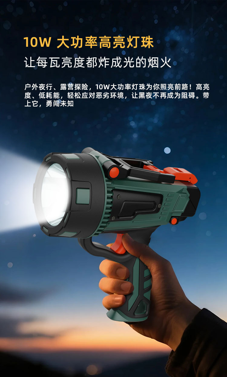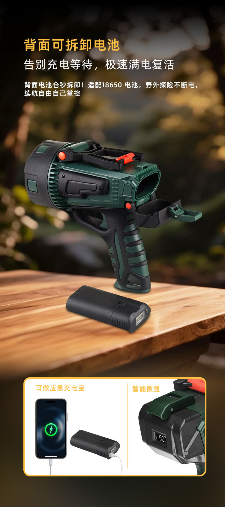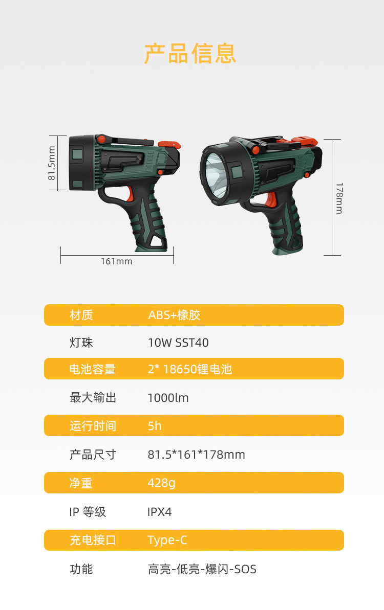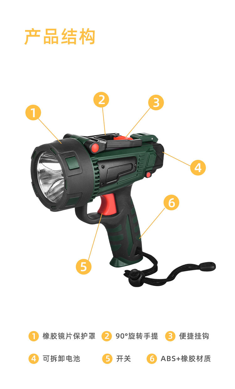 跨境大功率可拆卸充电枪型手持射灯户外工矿灯便携工地手持探照灯跨境1000流明200米远射程可拆卸充电电池枪型手持射灯户外照明便携探照灯,主打 4 大核心卖点:
