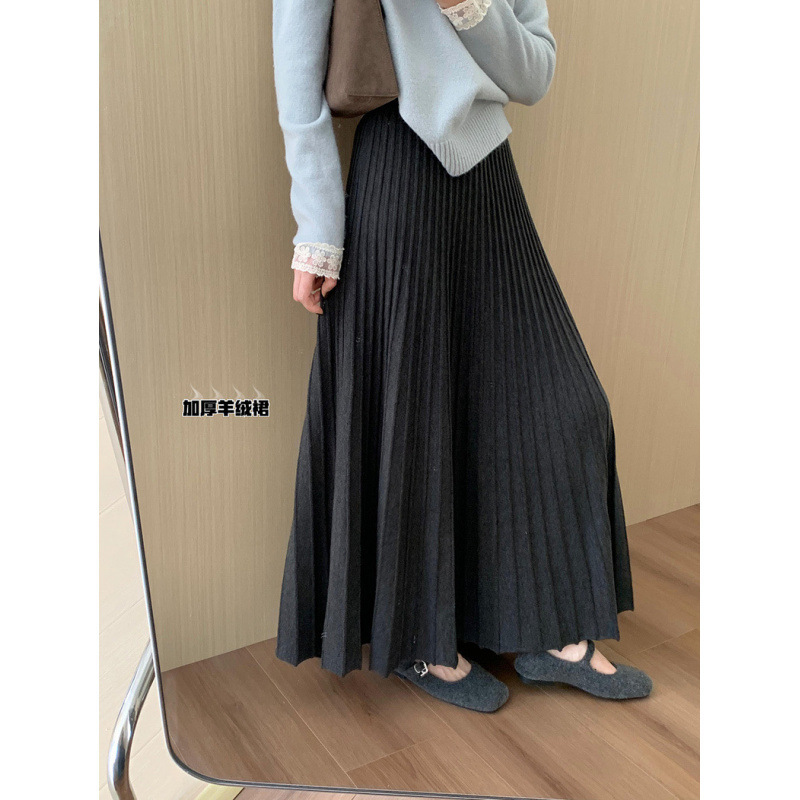 ハイウエストスリムミッドレングス厚みのあるプリーツニットスカート女性のための 2024 冬の新しい韓国スタイルカジュアル傘スカート