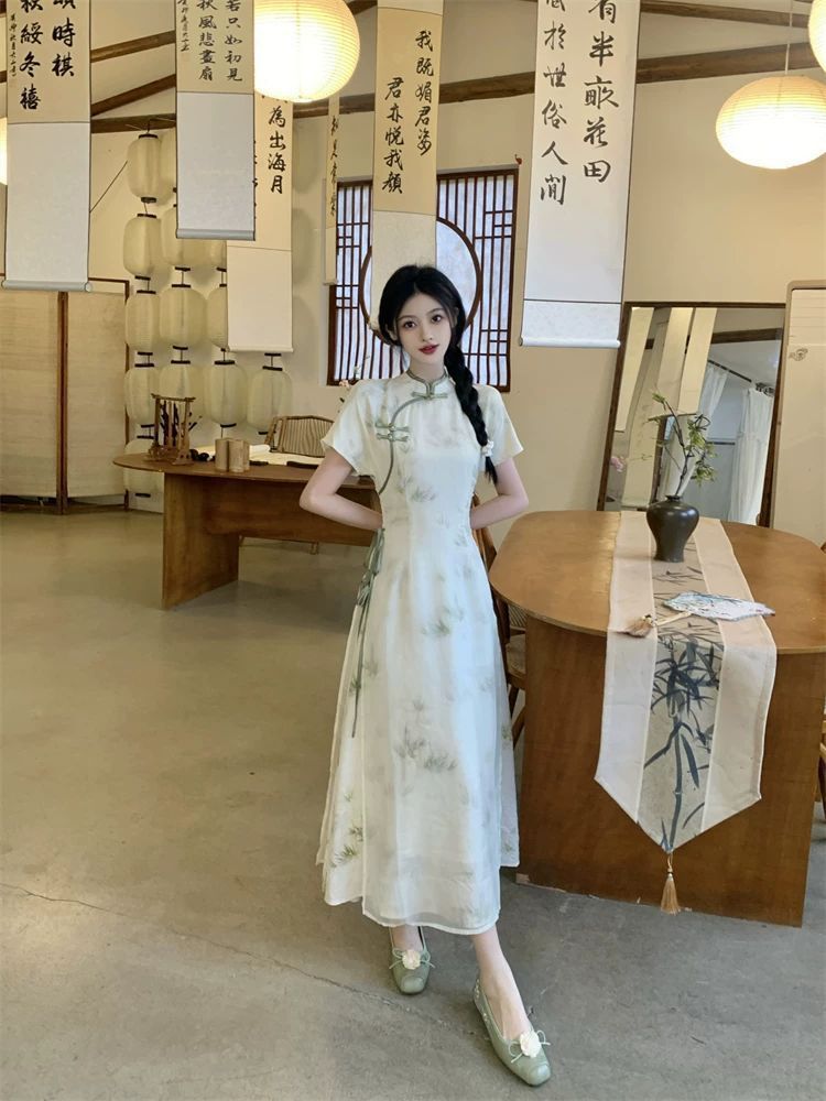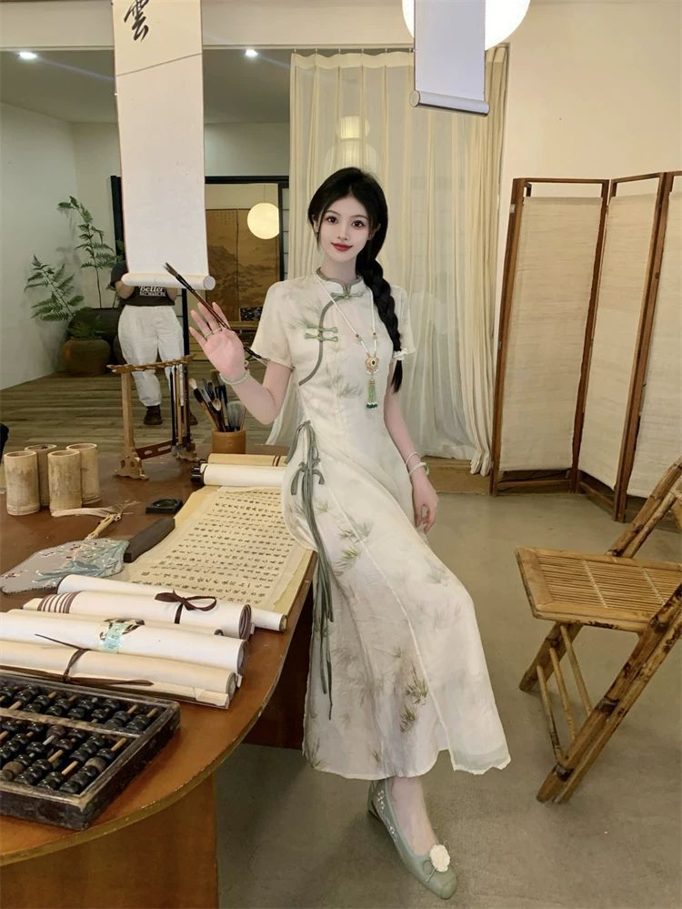 ダークグリーンのチャイナドレス2025新しい改良された女性の夏スタイル若いスタイル逆大きな袖古代スタイル