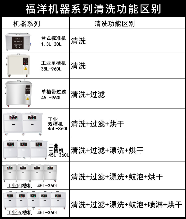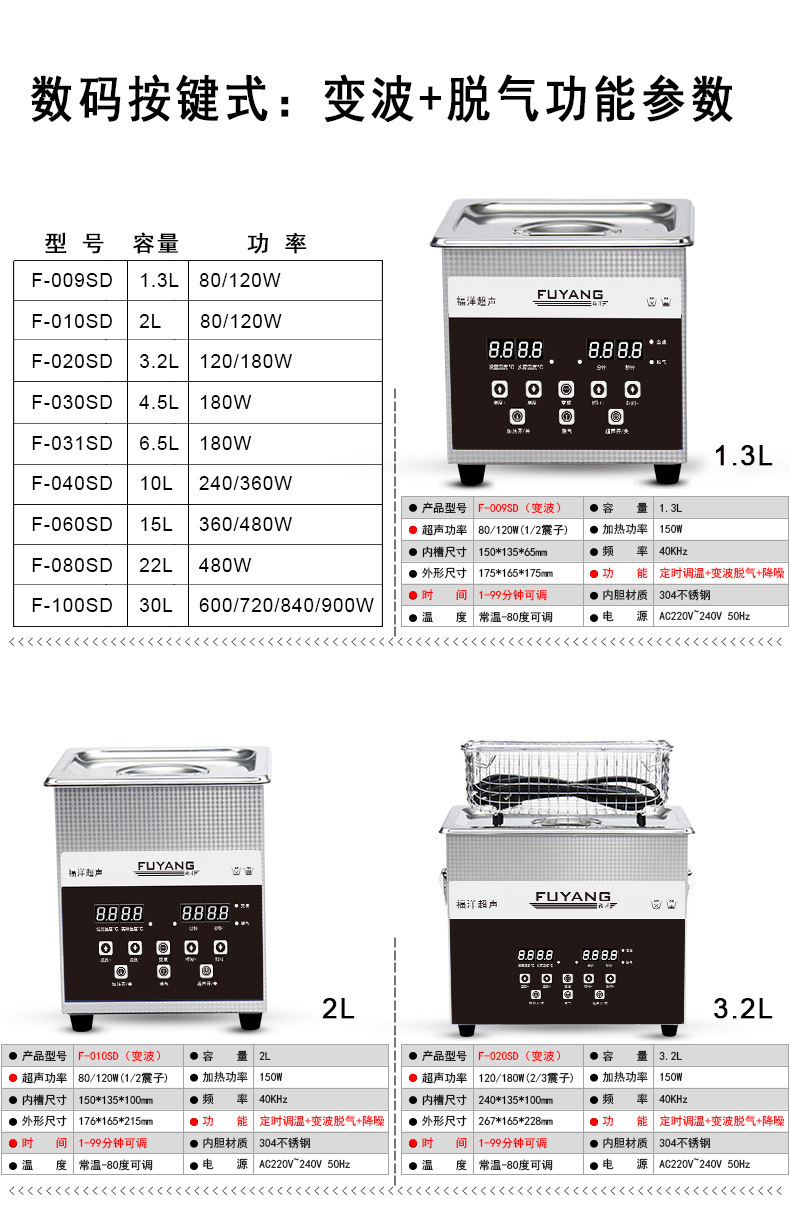 F—009S:1.3L80W(1个震子)+清洗篮,F—009SD【升级款】1.3L80W(1个震子)双功率可调+清,F—009SD【加强款】1.3L120W(2个震子)双功率可调+清,F—010S:2L80W(1个震子)+清洗篮,F—010SD【升级款】2L80W(1个震子)双功率可调+清洗,F—010SD【加强款】2L120W(2个震子)双功率可调+清洗,F—020S:3.2L120W(2个震子)+清洗篮,F—020SD【升级款】3.2L120W(2个震子)双功率可调+清,F—020SD【加强款】3.2L180W(3个震子)双功率可调+清,F—030S:4.5L180W(3个震子)+清洗篮,F—030SD【升级款】4.5L180W(3个震子)双功率可调+清,F—031S:6.5L180W(3个震子)+排水四件套+清洗篮,F—031SD【升级款】6.5L180W(3个震子)双功率可调+排,F—040S:10L240W(4个震子)+排水四件套+清洗篮,F—040SD【升级款】10L240W(4个震子)双功率可调+排,F—040SD【加强款】10L360W(6个震子)双功率可调+排,F—040SD【加强版】10L480W(8个震子)双功率可调+排,F—050S:14L300W(5个震子)+排水四件套+清洗篮,F—050SD【升级款】14L300W(5个震子)双功率可调+排,F—050SD【加强款】14L360W(6个震子)双功率可调+排,F—050SD【加强款】14L540W(9个震子)双功率可调+排,F—060S:15L360W(6个震子)+排水四件套+清洗篮,F—060SD【升级款】15L360W(6个震子)双功率可调+排,F—060SD【加强款】15L480W(8个震子)双功率可调+排,F—060SD【加强款】15L600W(10个震子)双功率可调+排,F—070S:19L420W(7个震子)+排水四件套+清洗篮】,F—070SD【升级款】19L420W(7个震子)双功率可调+排,F—070SD【加强款】19L540W(9个震子)双功率可调+排,F—070SD【加强款】19L720W(12个震子)双功率可调+排,F—080S:22L480W(8个震子)+排水四件套+清洗篮,F—080SD【升级款】22L480W(8个震子)+双功率可调+排,F—080SD【加强款】22L600W(10个震子)+双功率可调+,F—080SD【加强款】22L720W(12个震子)+双功率可调+,F—100S:30L600W(10个震子)+排水四件套+清洗篮】,F—100SD【升级款】30L600W(10个震子)双功率可调+排,F—100SD【加强款】30L720W(12个震子)+双功率可调+,F—100SD【加强款】30L900W(15个震子)+双功率可调+,F—100SD【加强款】30L1080W(18个震子)+双功率可调+,F—120ST:38L600W(12个震子)+清洗篮,F—120A:45L700W(14个震子)+清洗篮,F—180A:61L900W(18个震子)+清洗篮,F—240A:88L1200W(24个震子)+清洗篮