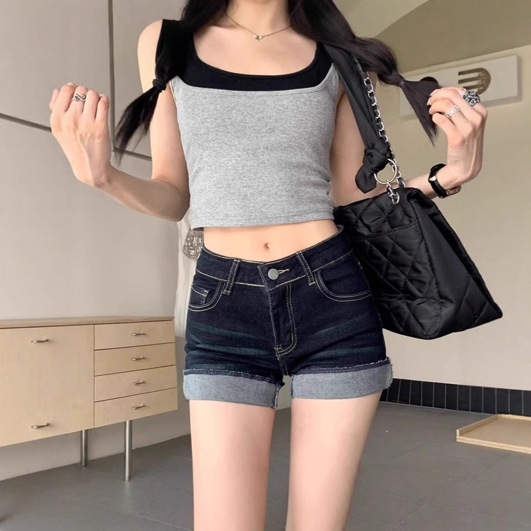 女性用ウォッシュドカフデニムショートパンツ2025夏ホットガールハイウエストスリムAラインパンツストレッチタイトヒップカバーホットパンツ