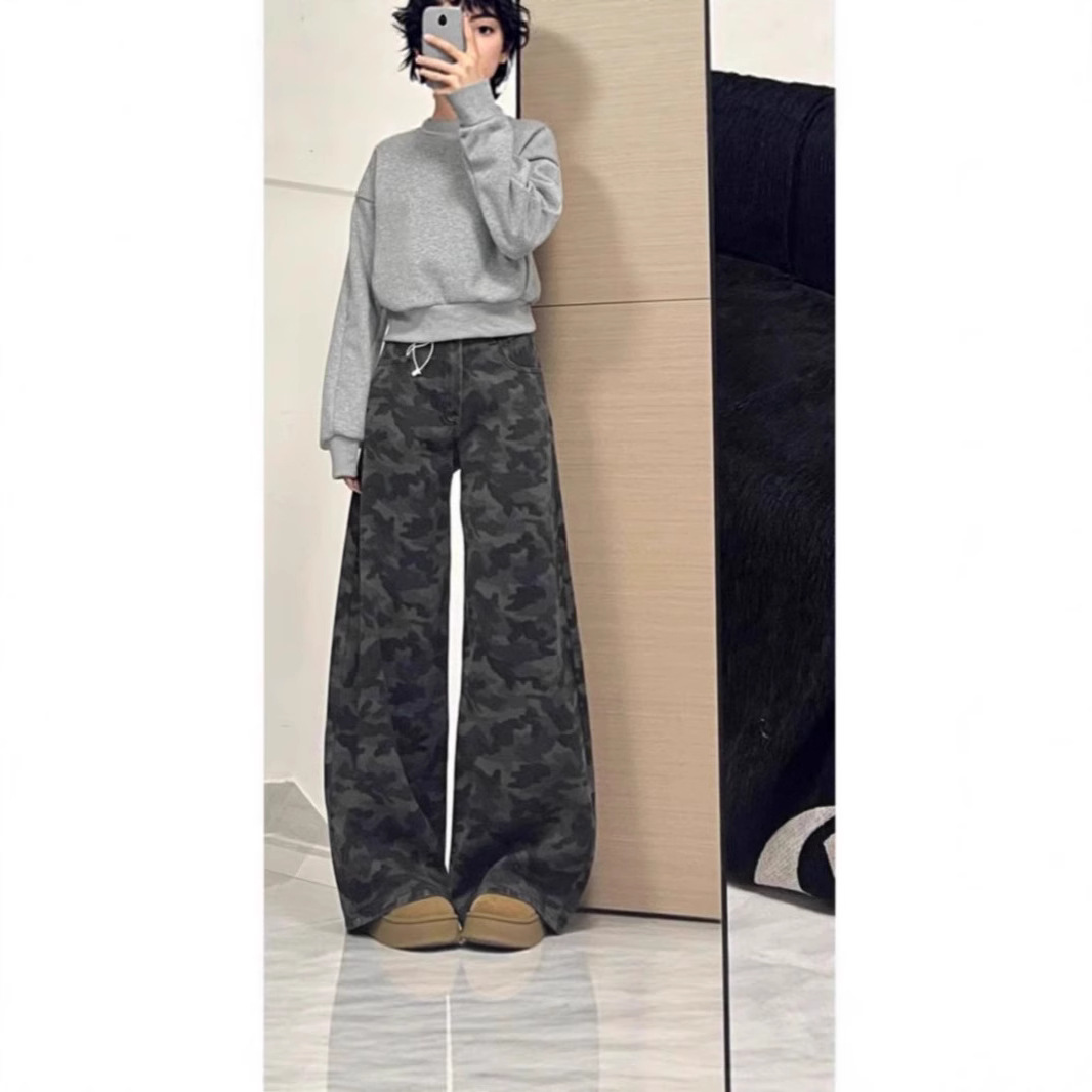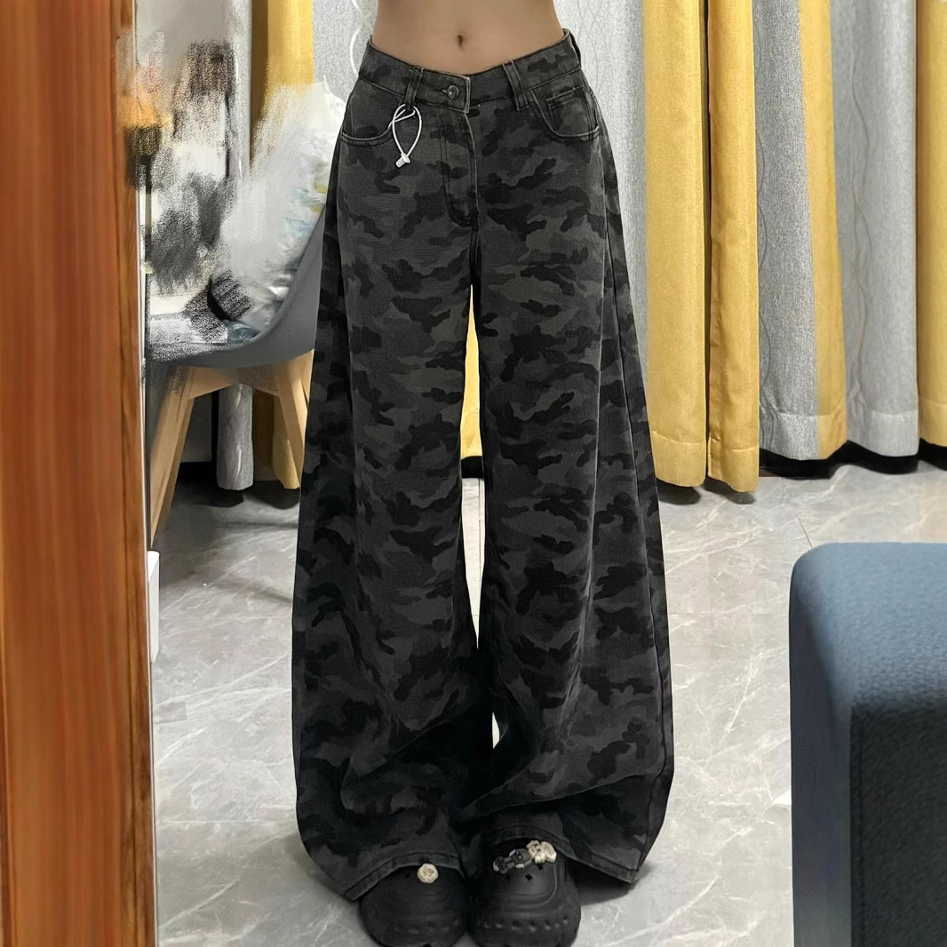 アメリカンレトロ迷彩パンツジーンズワイドレッグパンツレディース春夏ハイウエストニッチルーズカジュアルフロアレングスパンツストレートパンツ