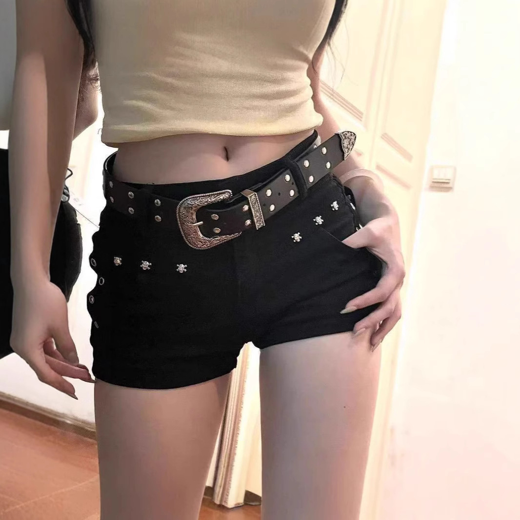 アメリカンホットガールダークy2kヒップカバーリトルブラックパンツリベットデザインデニムショートパンツレディースローウエストスリムホットパンツ