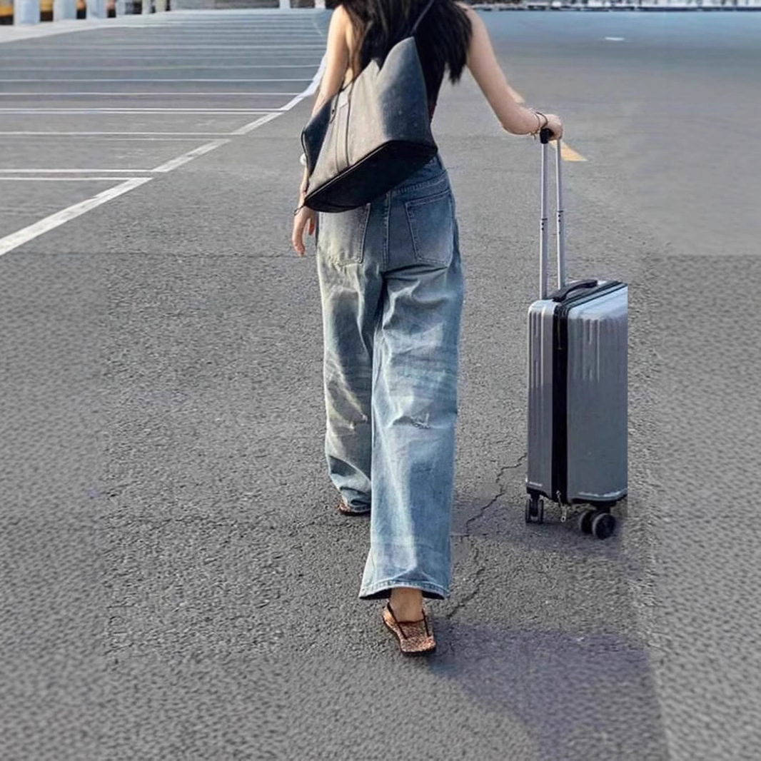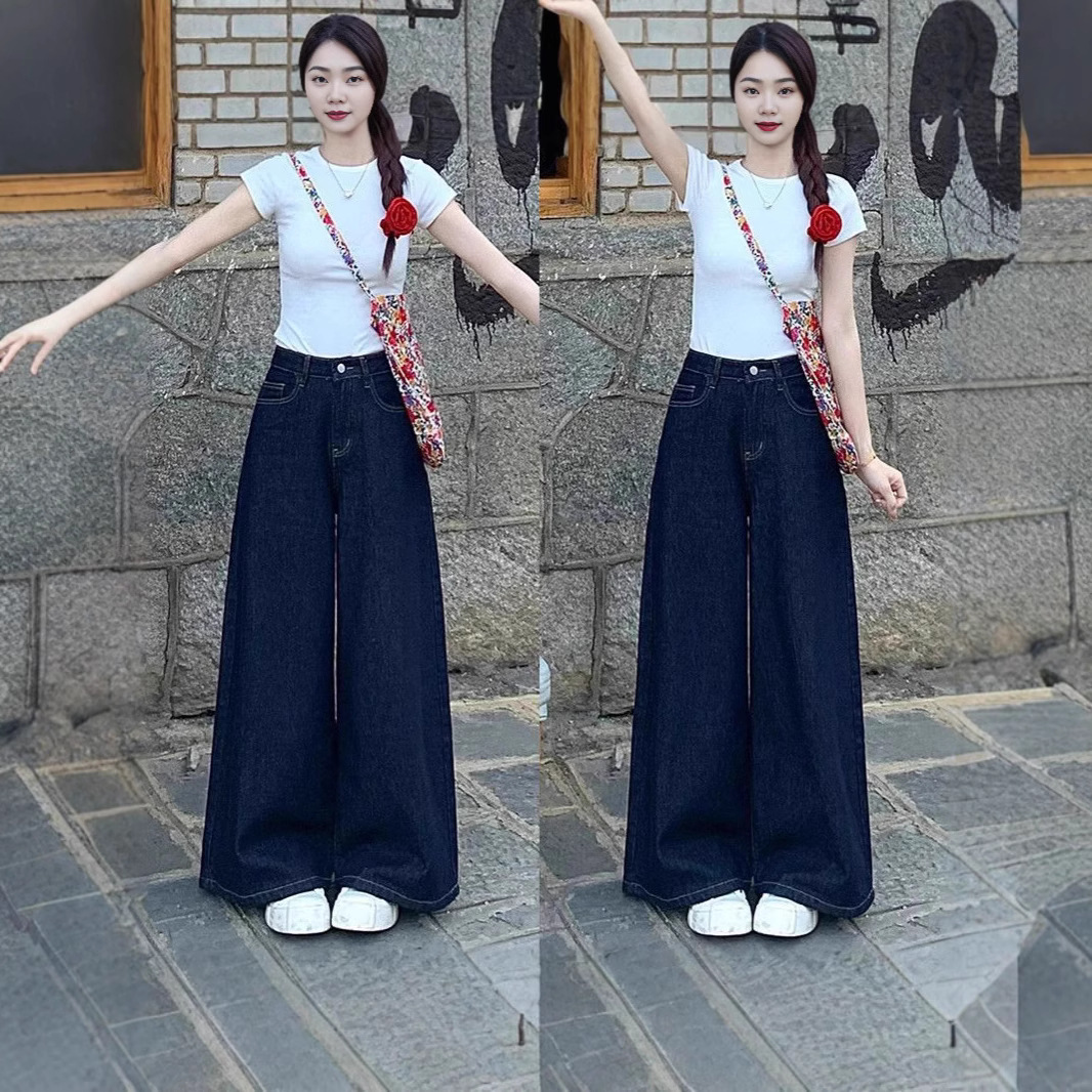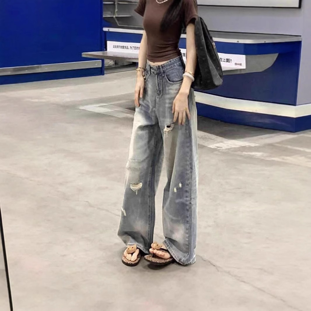 夏の女性用アメリカンスタイルのリップドワイドレッグジーンズ、スリムで小柄な人向けの新しいスタイル、ゆったりとしたハイウエストのストレートレッグ、多用途のフロアレングスパンツ