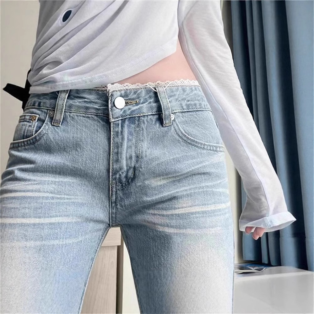 ホットガールライトカラーデザインマイクロフレアジーンズレディースレースステッチ春の新作スリムフィット馬蹄パンツ