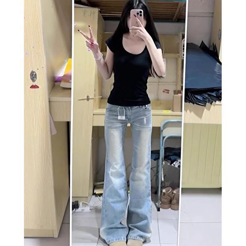 美式辣妹低腰修身微喇牛仔裤女秋季百搭紧身显瘦直筒喇叭裤