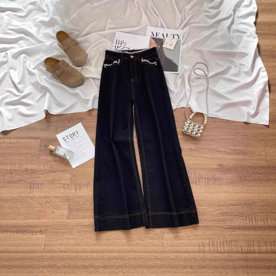 加绒加厚黑色阔腿蕾丝牛仔裤春夏高腰新款宽松显瘦不贴花边喇叭裤
