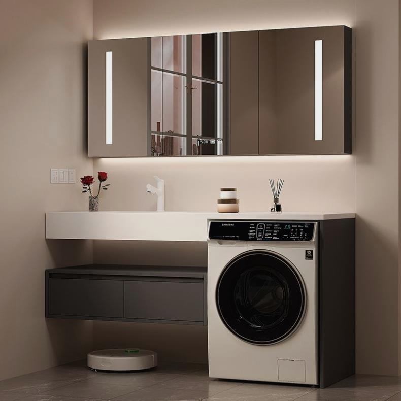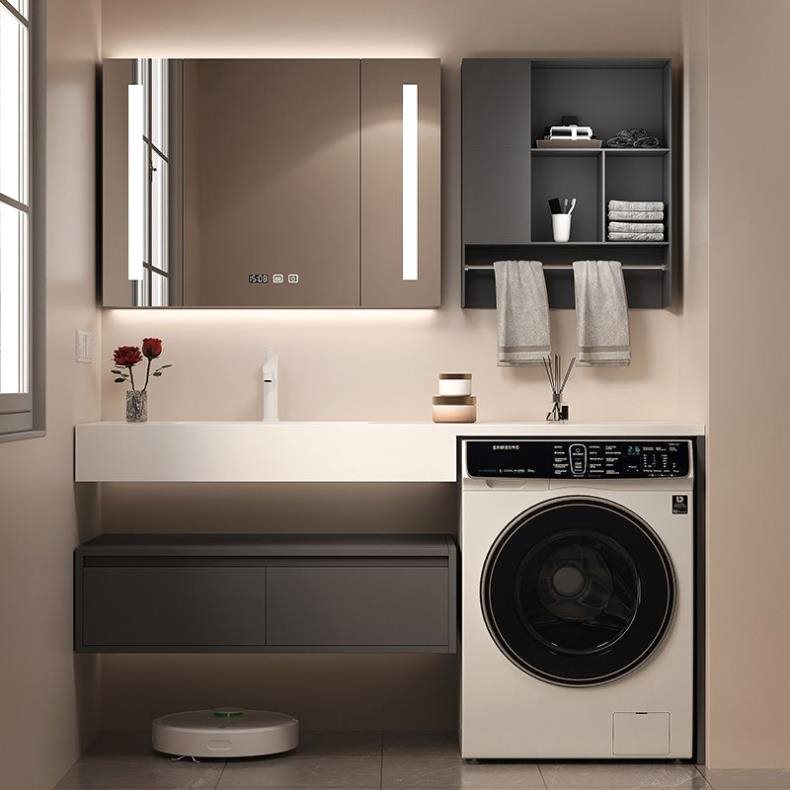 クリームスタイルバルコニー洗濯機一体型キャビネット組み合わせモダンシンプルロックボードバスルームキャビネットシームレスセラミック洗面台