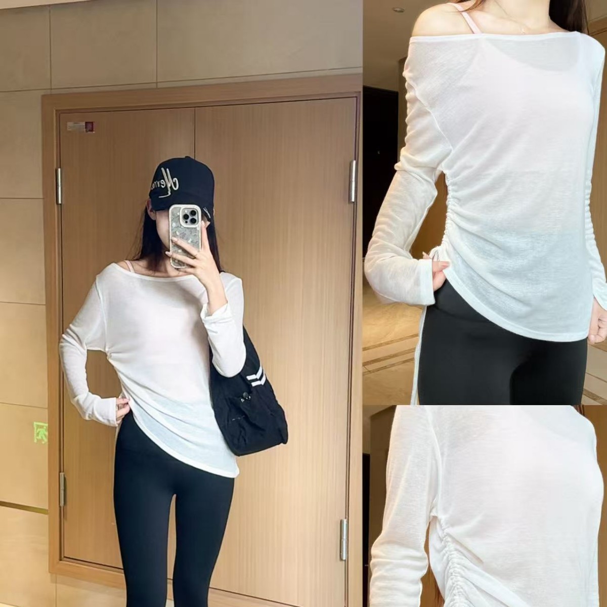现货lulu同款长袖一字肩上衣弧形下摆女T恤侧边抽褶瑜伽健身服女